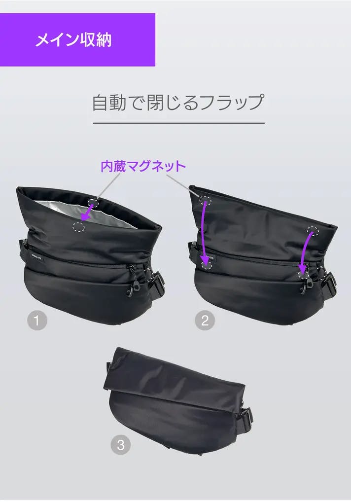 メイン収納の開口部は内部のマグネットでフラップが自動的に閉まる仕組み。アイテムの出し入れがストレスフリーでスムーズに。