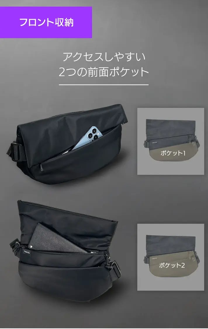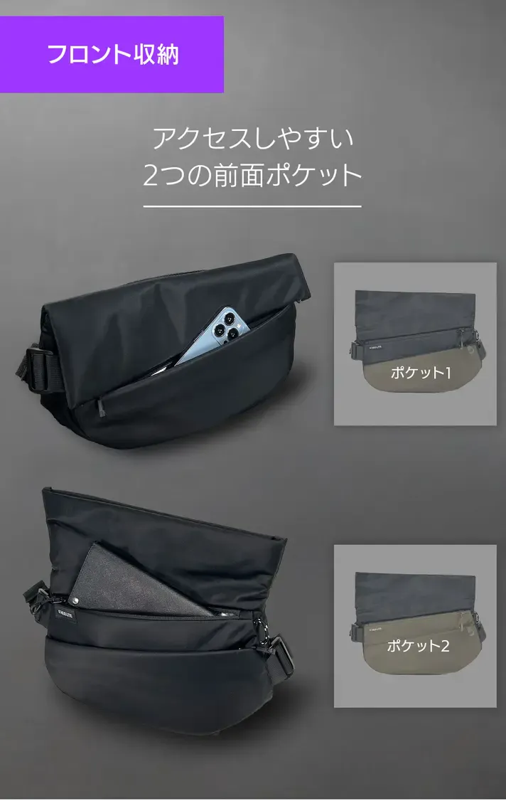 最前面のポケット1はフラップを閉じたままアクセス可能。スマホなど使用頻度の高いアイテムをすぐに取り出せます。前面上段のポケット2は深さのあるフリー収納ポケット。長財布や小物類などを収納できます。