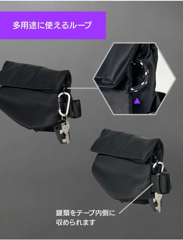 本体のサイドに小さめのループを設置。ファスナーの簡易ロック以外にもカラビナや鍵をかけるなど様々な用途で使用できます。