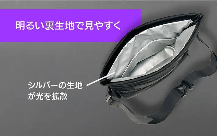裏生地にはシルバーのポリエステル生地を使用。光を拡散しやすい素材でバッグ内部が明るく見やすい仕様。