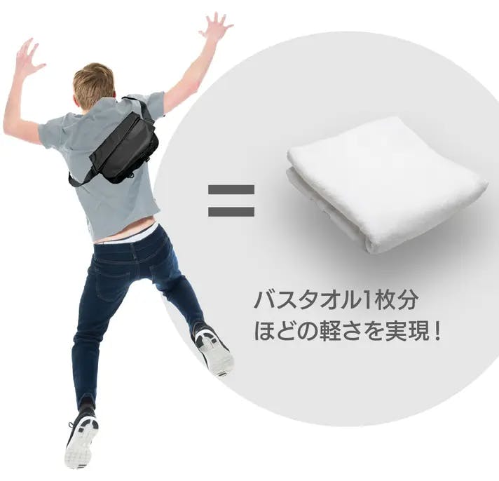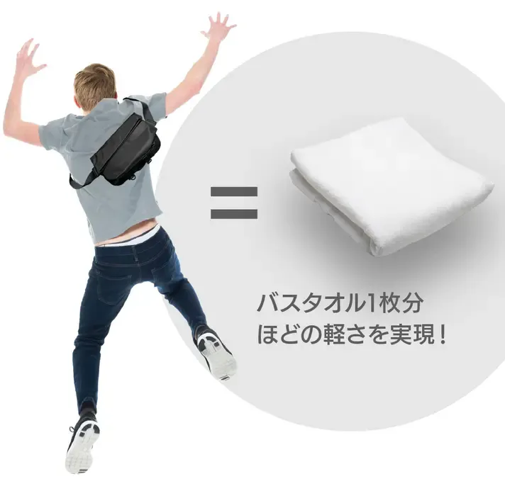 「軽量×冷却=軽涼スリングバッグ」は、旅行やお買い物、街歩きなど日常の様々なシーンで活躍します。本体は「バスタオル1枚ほどの軽さ」を実現。肩の負担を軽減します。背中に当たる部分は保冷剤を入れられるメッシュ構造ででも真夏の猛暑日でも涼しく持ち歩けます。