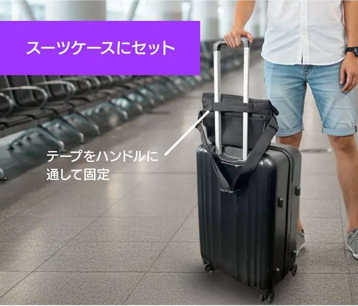 スーツケースにセットして固定できるキャリーオン機能を搭載。背面のテープをハンドルに通してバッグを固定できます。荷物をまとめて移動できます。