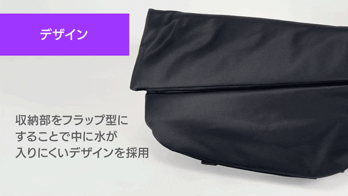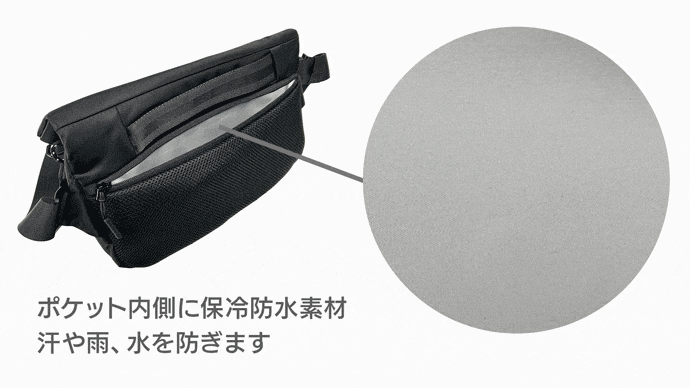 背面ポケットの内側には、保冷バッグにも使われる保冷生地を採用。この素材は水を通さない特性もあるため、雨や真夏の汗もバッグの中に染み込まないようにしっかりガード。バッグ内部への染み込みを防ぎます。