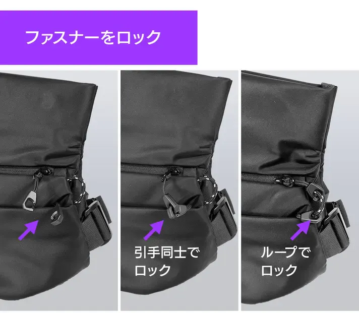 ファスナーの不用意な開閉を防止するロック機能付きの引手を使用。引手同士を固定したり本体のループに留めることでロック状態に。移動時の大切な荷物を守りサポートします。