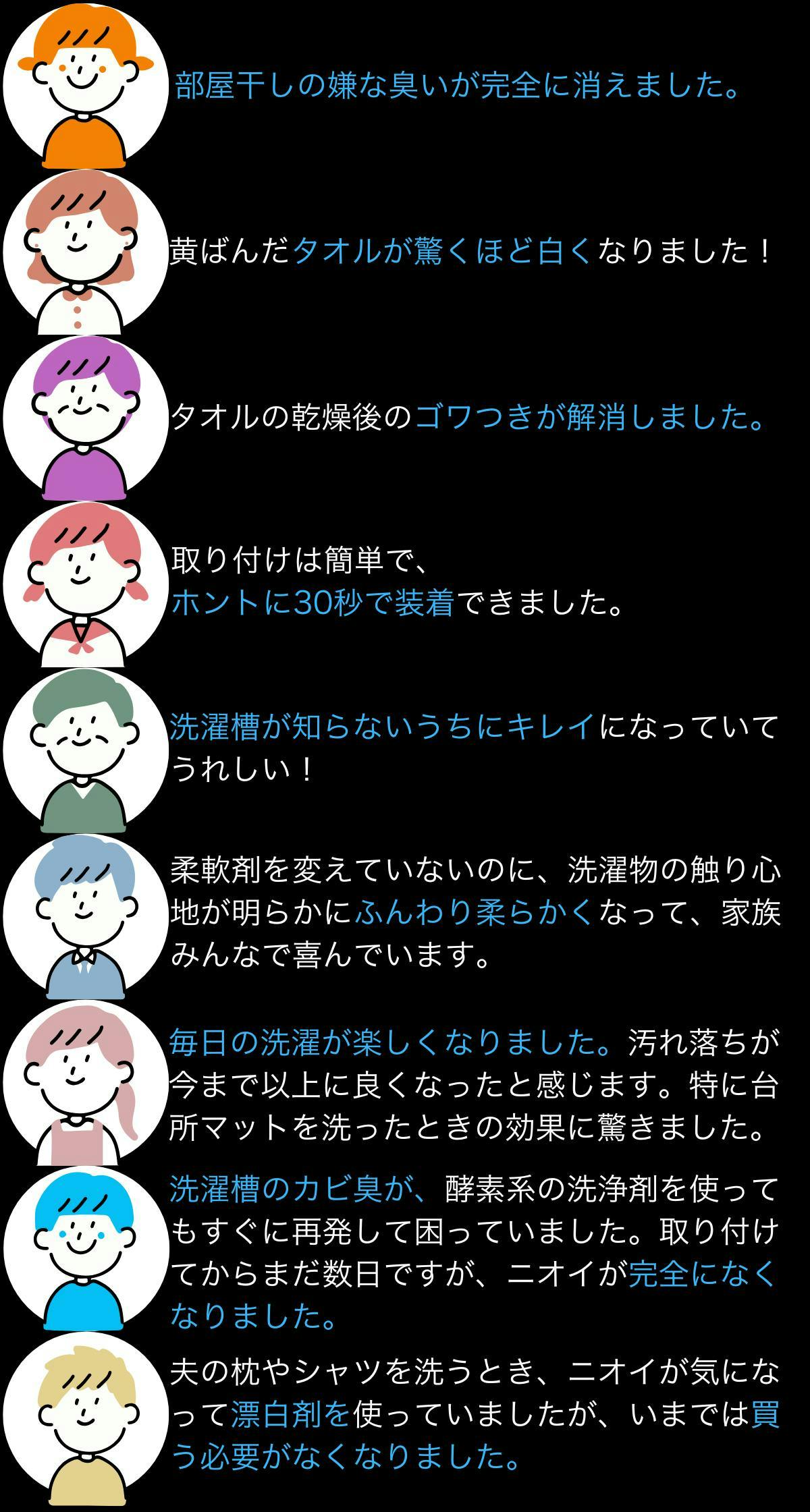 「子供が空手をやっているのですが、手に付ける防具(拳サポーター)がいつも臭くて臭くて…。普段は洗濯機にいれ、洗剤をいれ、ワイドハイターを振りかけ 少しつけ置きしたのち洗濯をしていて、それでも洗い上がりの匂いが『酸っぱ臭!!』っと言う感じだったのですが、今回、取り付けてから 普通に洗剤だけで洗ってみたところ、信じられないのですが…あの何をしても臭かったサポーターが!洗剤のいい匂いに洗い上がって来ました! これには本当に驚いて、何度も匂いを嗅いでました(笑)子供も『臭くない!」』と喜んでいます!道着もなんだか洗い上がりがさっぱりしています!」