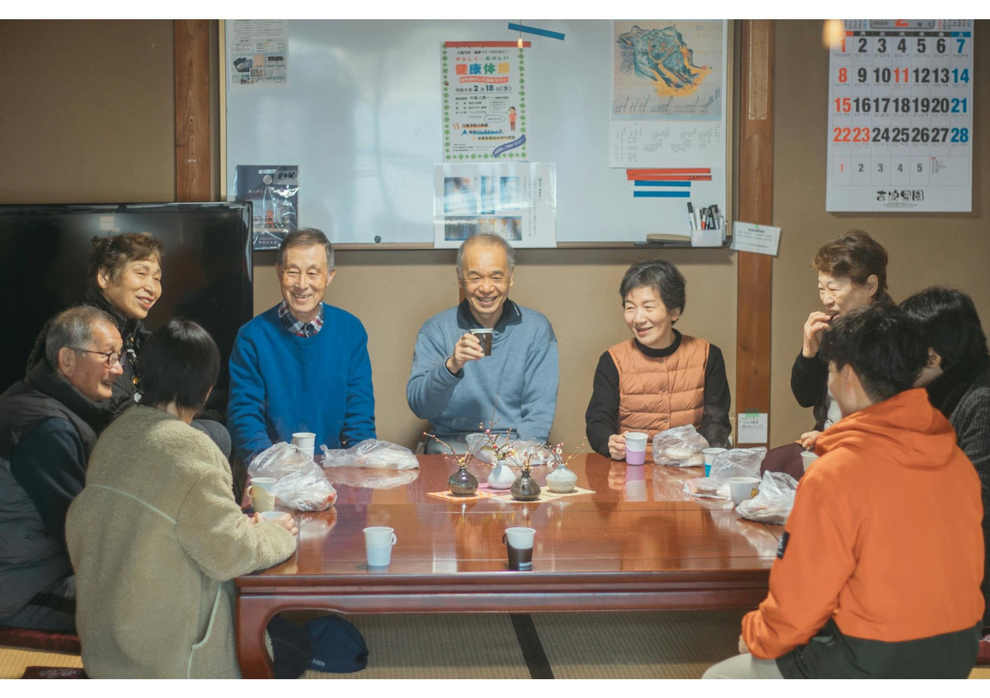 つながり: 地域サロンや体操に集い、共に笑い助け合う温かなコミュニティ。