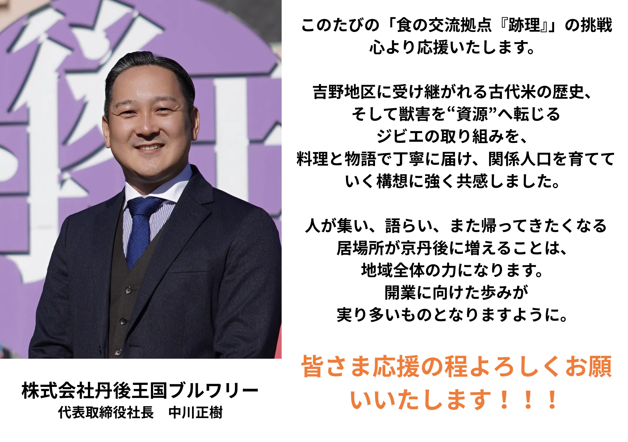 オープン当日までの準備の裏側や、私たちが大切にしている古代米やジビエの料理が形になっていくプロセスも、ぜひ「この活動報告ページ」や「Instagram」を通じて一緒に楽しんでいただけたら幸いです。