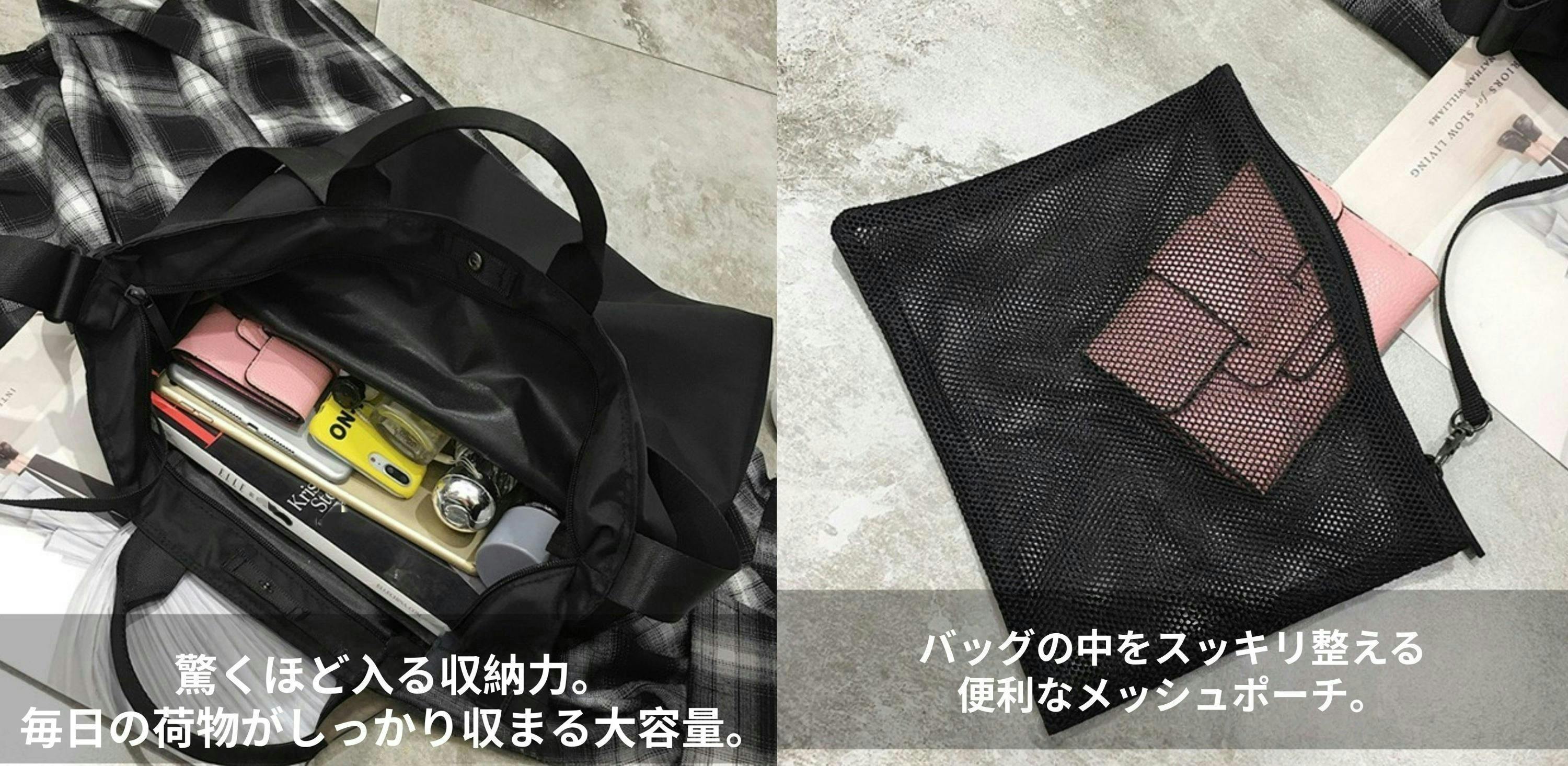 荷物が多くても安心。メッシュポーチ付きでバッグの中がスッキリ。