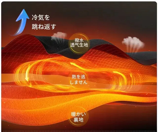 撥水生地、エアロゲル、ソロナの3層の生地を使用した「エアロゲルジャケット」は、体から発生する熱を衣服を通じて外部に放散するのを抑制し、保温効果を実現します。