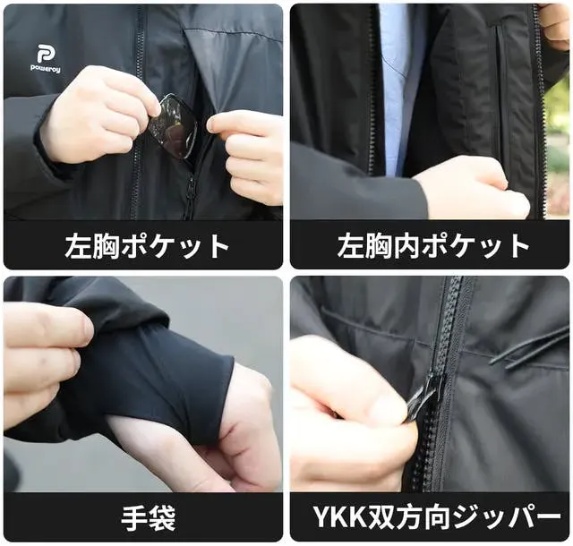 POWEROYは大雨に対応する耐水圧13,000mm以上の性能でレインウェアとしても使用可能。