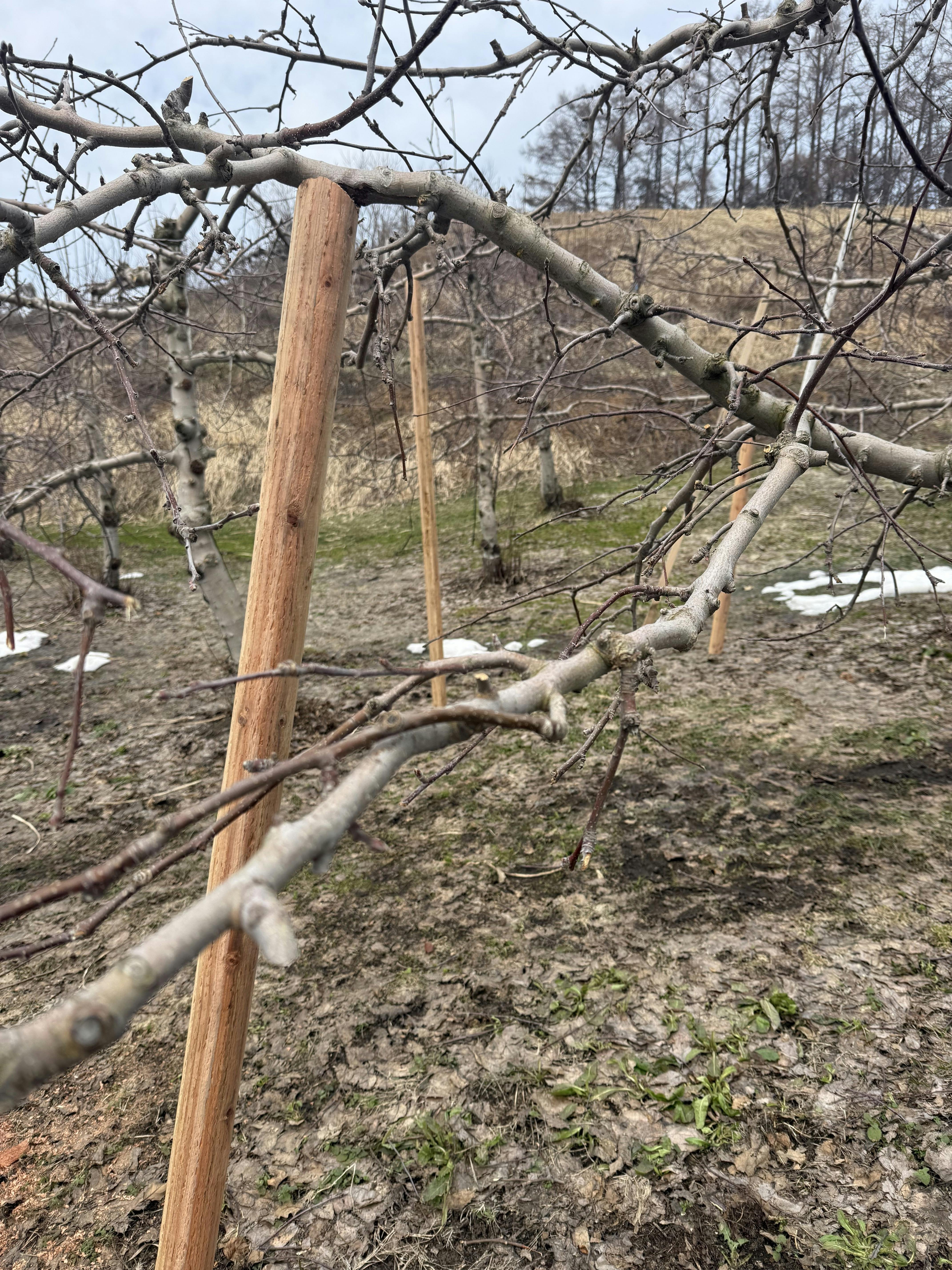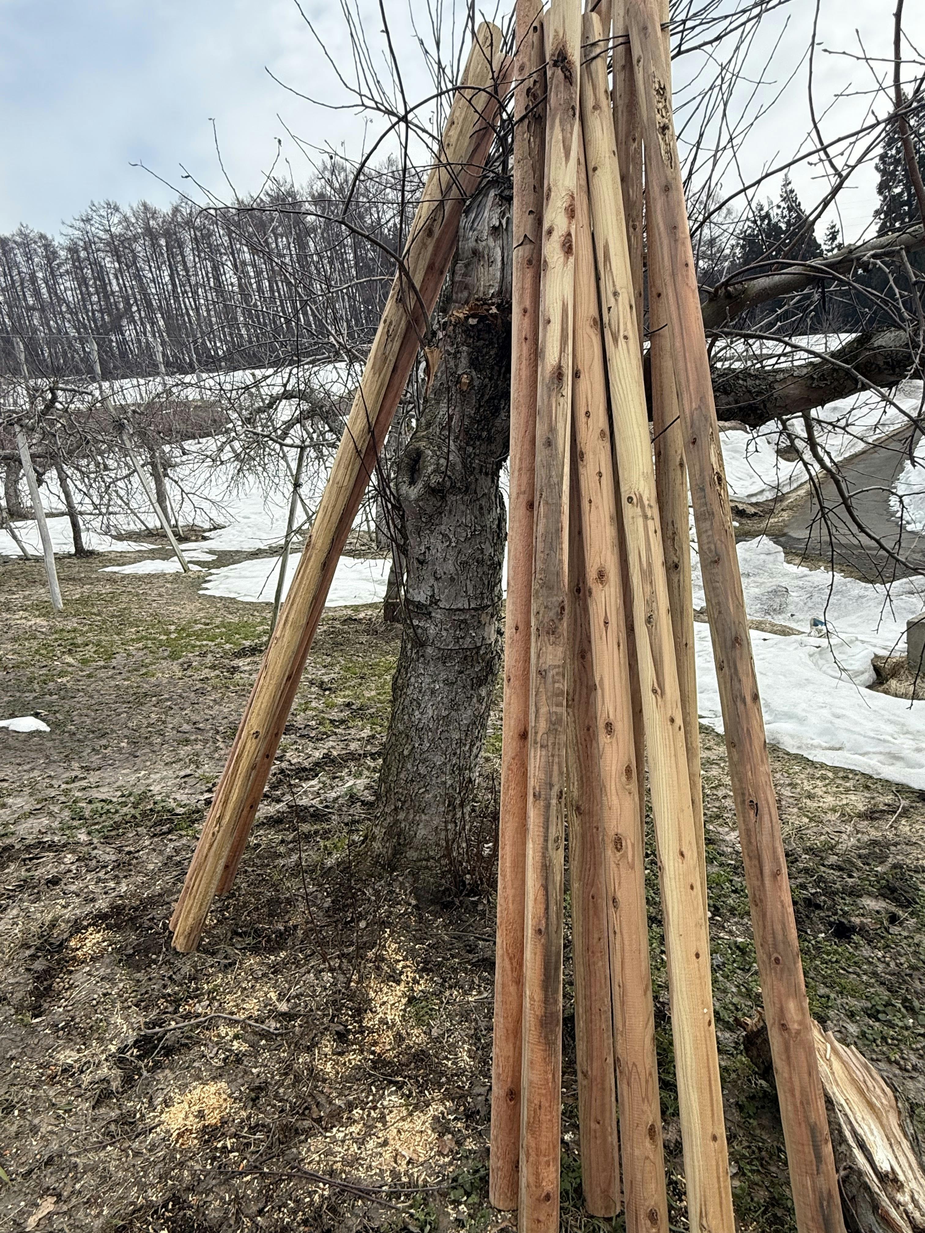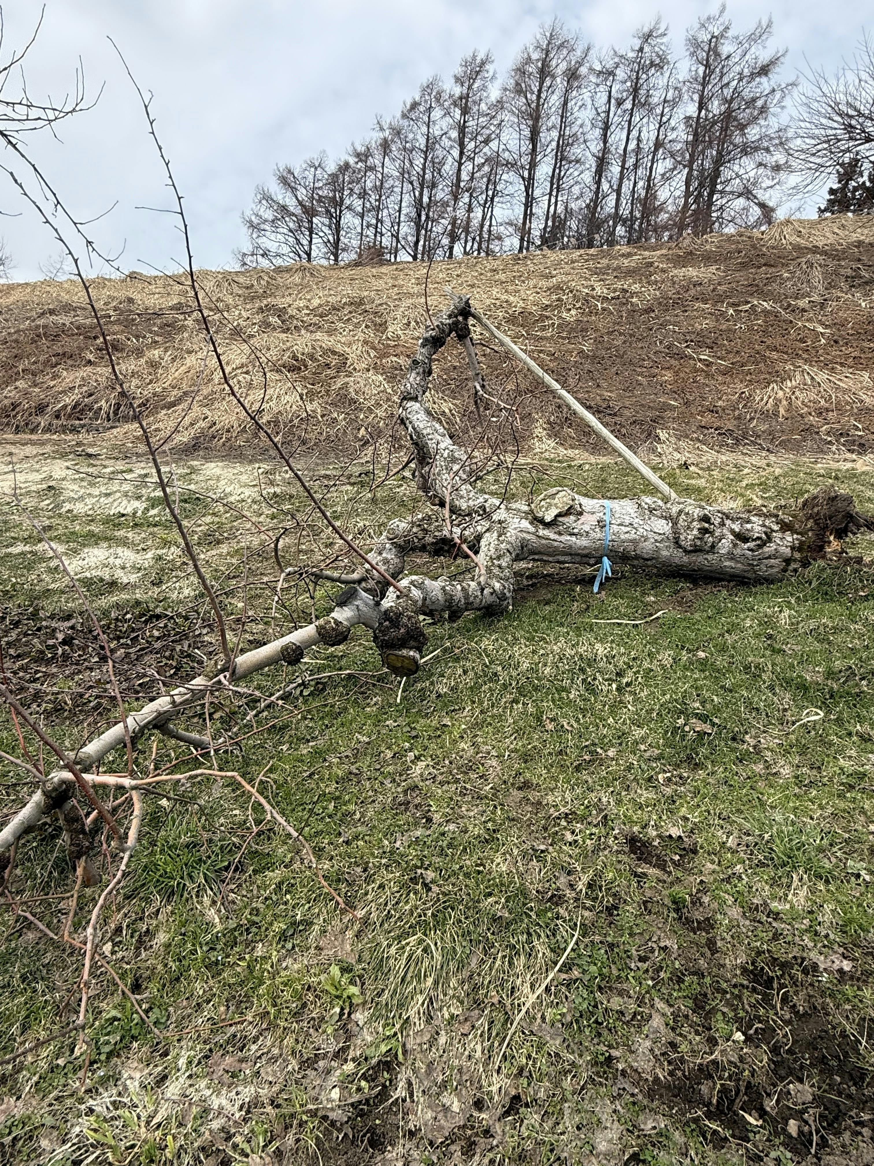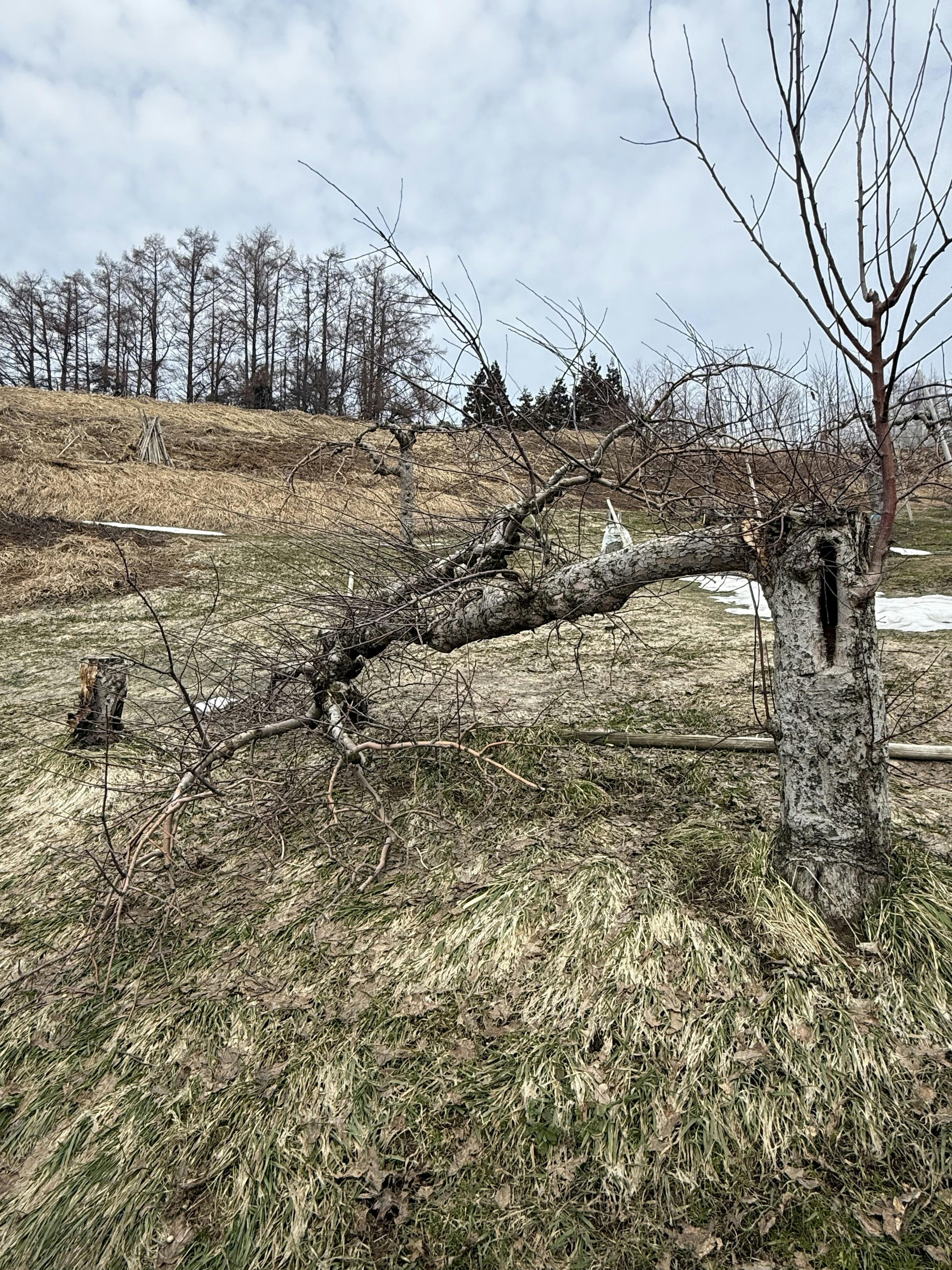 剪定作業 倒された木の片付け 農薬散布準備 助かりそうな枝の補強などです。