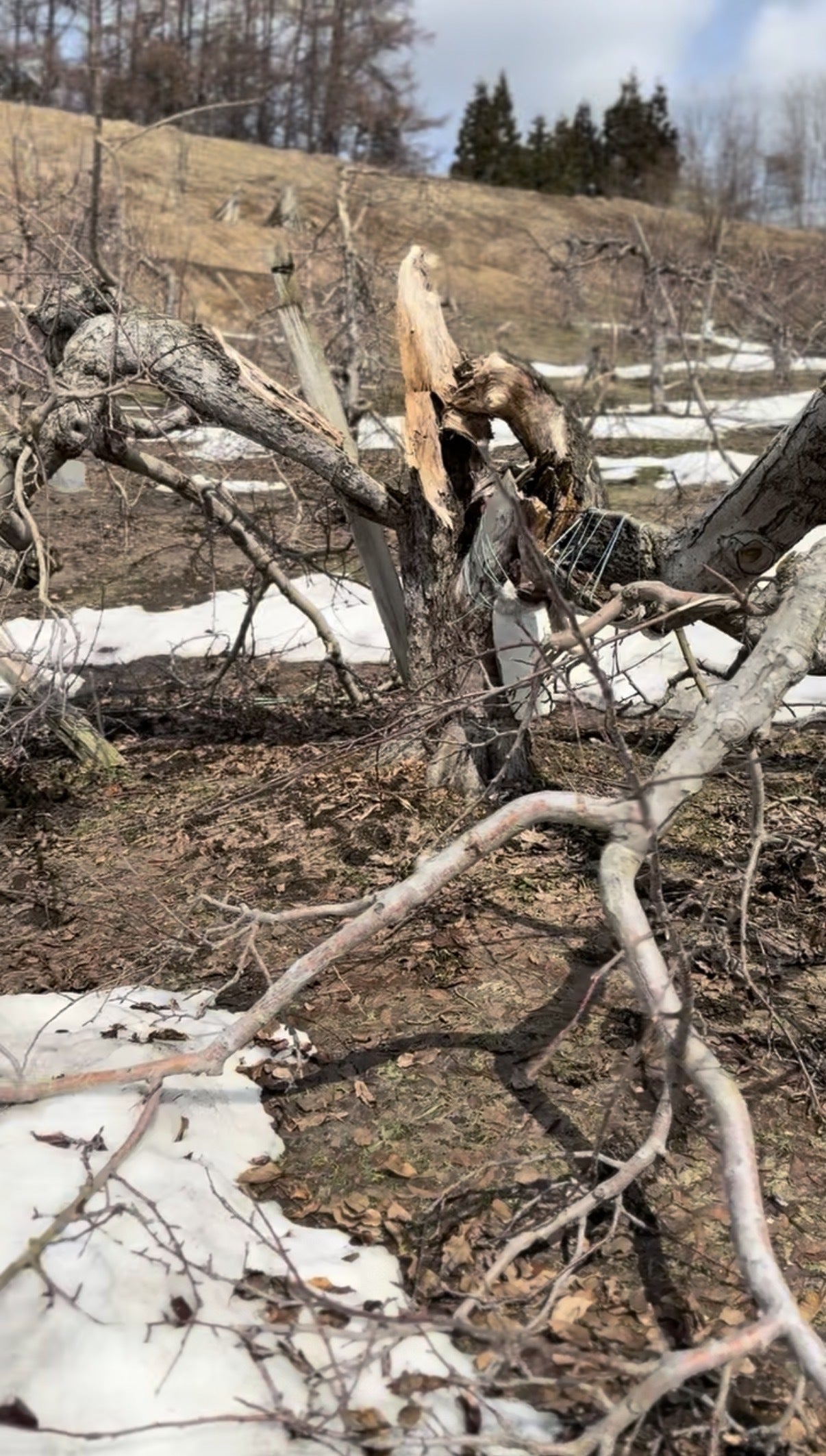 2026/04/02 14:05今年も去年にまして雪が多く多くの木が犠牲になりました。雪の重さで折れてしまった木根本から折られた木現在の作業は、剪定作業 倒された木の片付け 農薬散布準備 助かりそうな枝の補強などです。突っ張り用の丸太丸太で支えた枝このようにしてまだ助かる枝を支えていきます。災害の後は作業が増えて、なかなか思うように進みませんが、皆様からの応援の言葉に励まされ日々頑張っています。ただただ感謝の一言に尽きます。引き続き作業の経過をアップしていきますのでよろしくお願いいたします。園主 木村将基 もっと見る