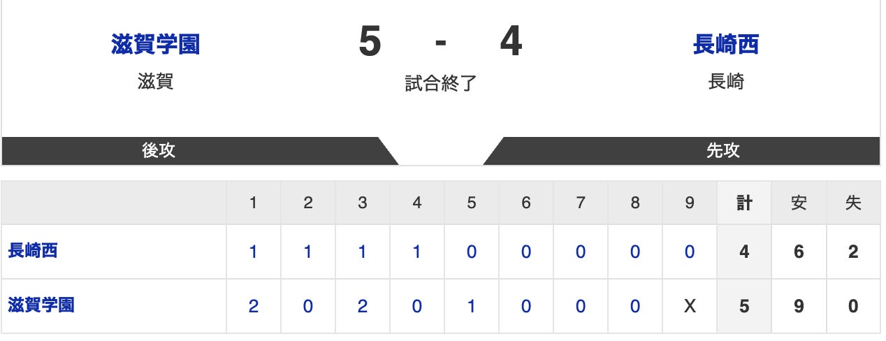 本日の第一試合、長崎西と滋賀学園の対戦は5−4で滋賀学園が勝利。長崎西は大健闘も及ばず残念ながら1回戦敗退となりました。幸先よく、初回の攻撃でみんなが待ち望んだ初ヒット。Hのランプが甲子園のスコアボードに灯り、3塁側アルプススタンドは歓喜に湧きました。前半は押し気味に互角の状態で試合を進めるも、中盤5回に1点を取られ、そのまま追加点を奪えず悔しい1点差での敗戦。全体を通してハラハラドキドキのシーソーゲーム。その清々しい戦いは全国の野球ファンに長崎西高の野球を強く印象づけたのではないでしょうか。選手達の甲子園での全力プレーに感動しました。「甲子園に連れて来てくれてありがとう」と言いたいです。本日は多くの方にアルプススタンドから熱い声援をいただきました。TVでもたくさんの方に見ていただけたのではないかと思います。本当に応援ありがとうございました。心より感謝申し上げます。
