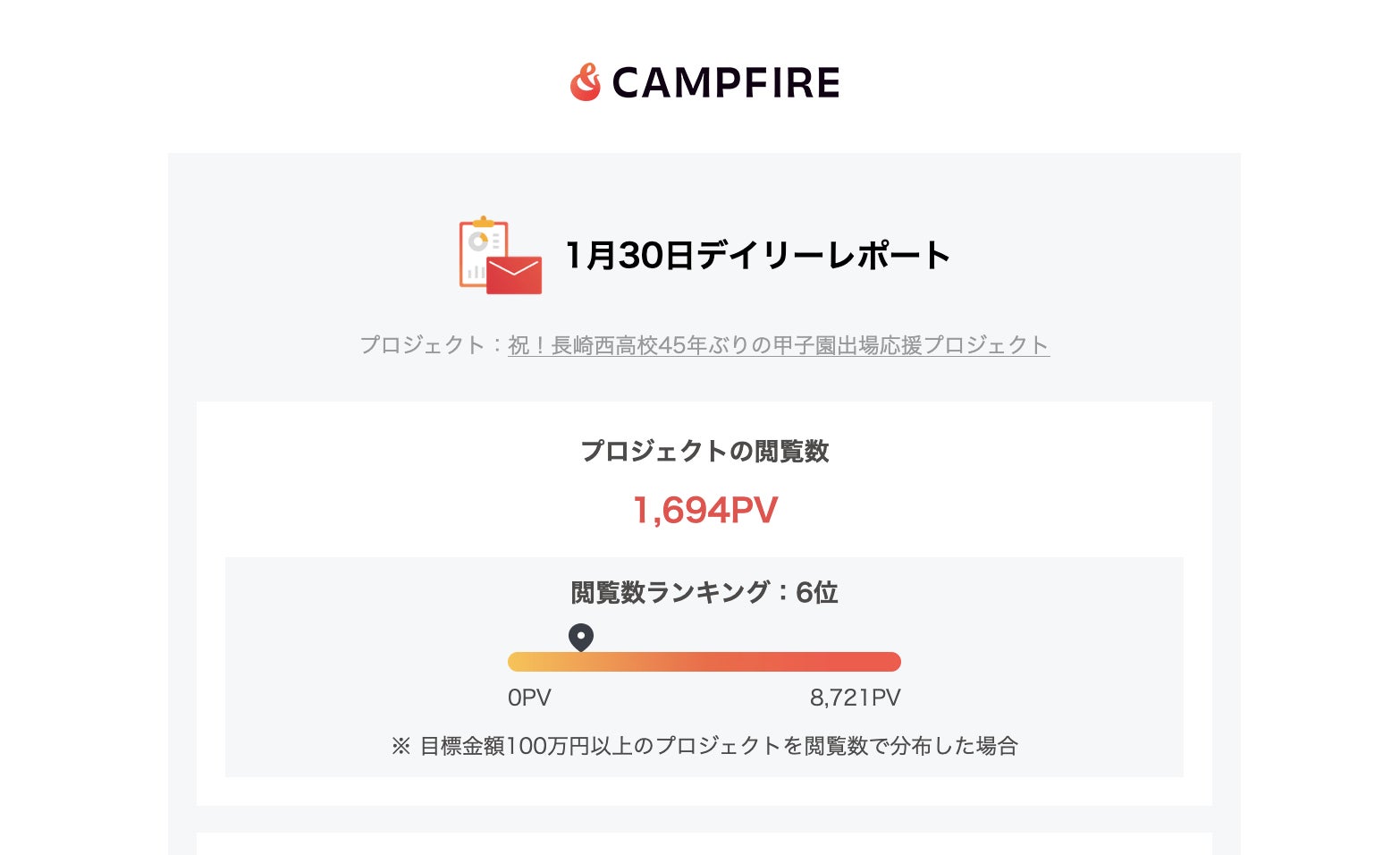 昨日(1月30日)の閲覧数が1694PVで、CAMPFIRE内でなんと6位でした!
