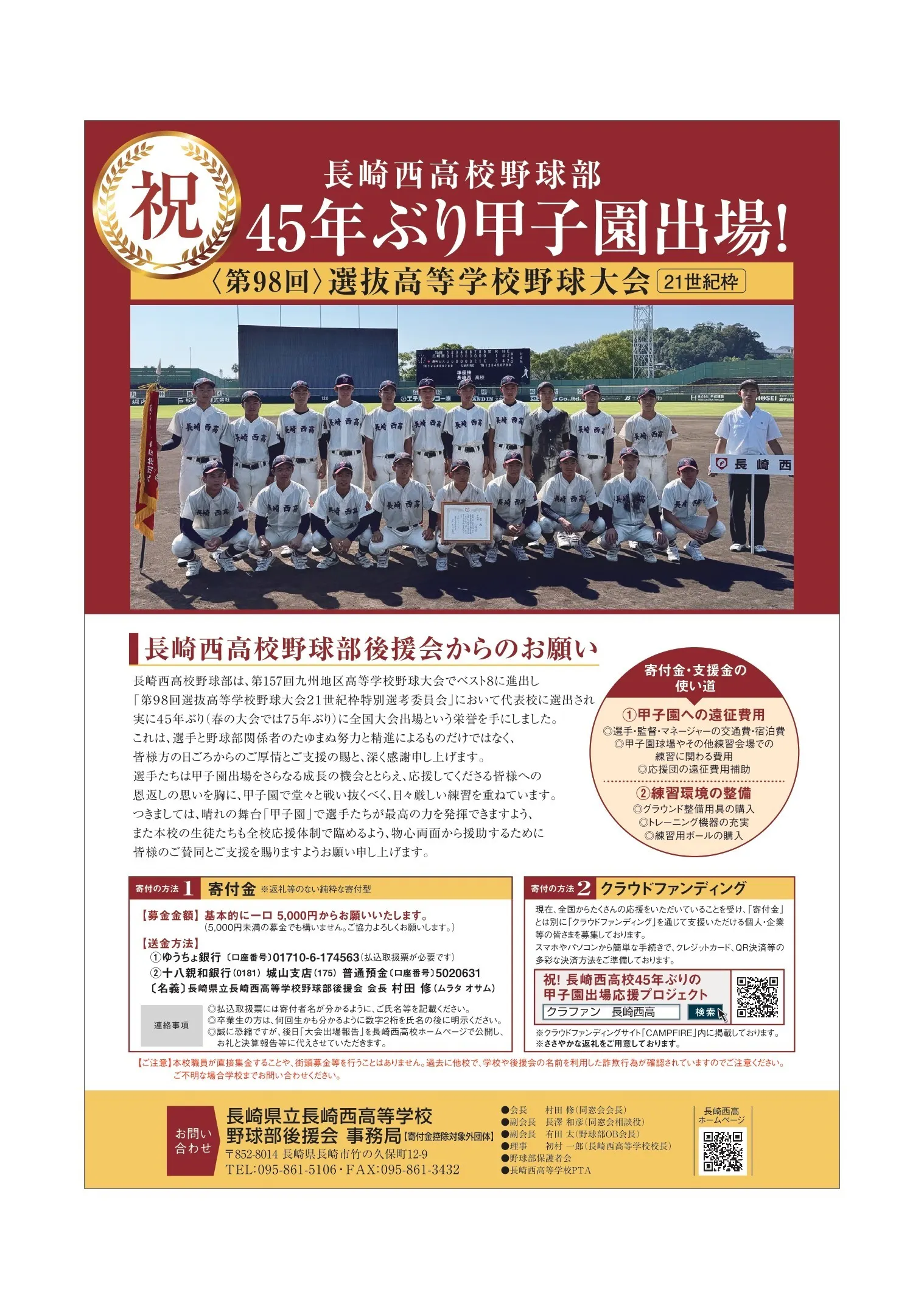 学校を挙げての甲子園出場に関する支援活動が本格化してまいりました。支援の輪が長崎から全国に広がっていくことを願って、引き続き応援の程よろしくお願いいたします。
