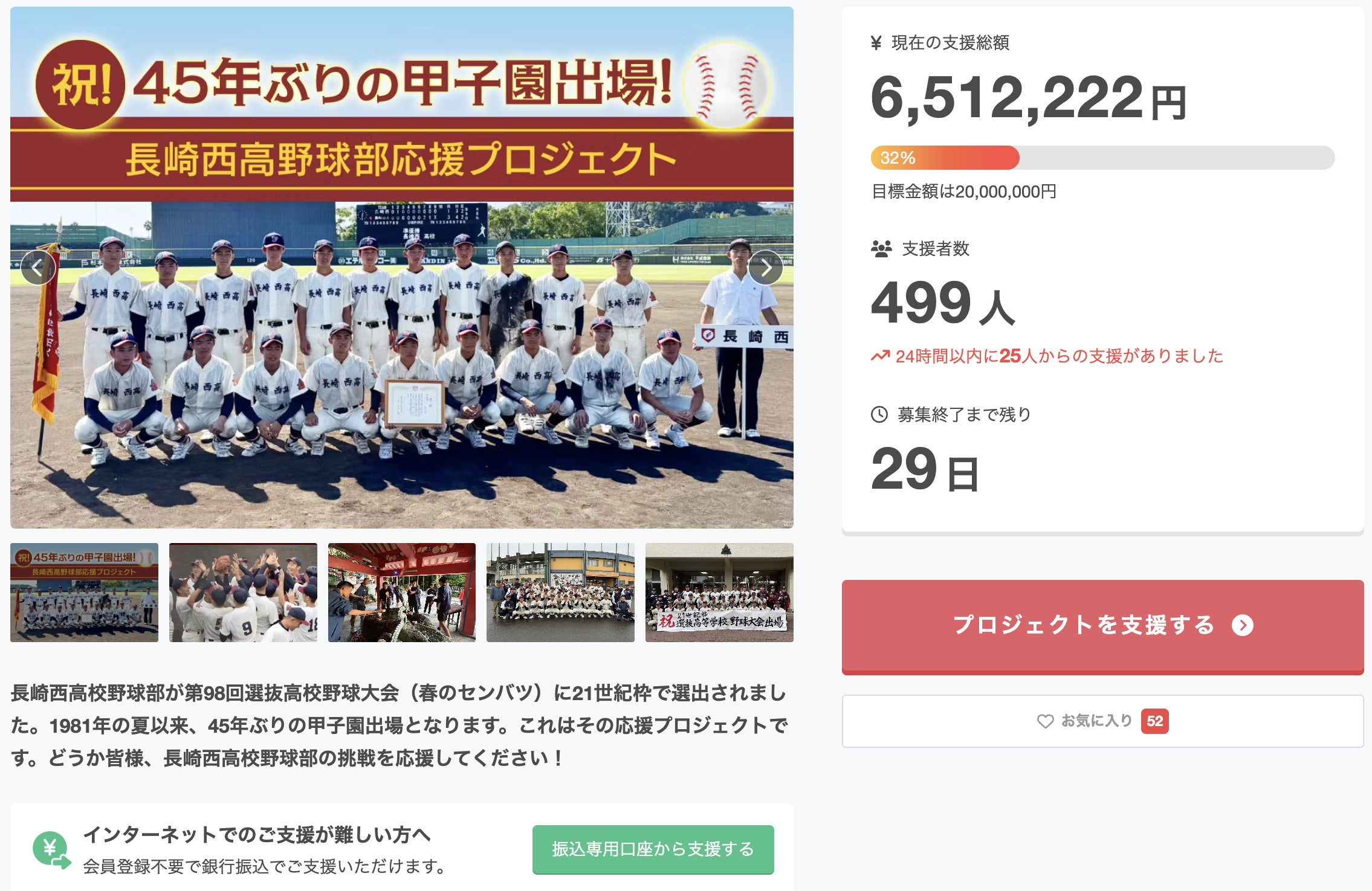 本日、組み合わせ抽選会が行われ、長崎西の1回戦の対戦相手が滋賀学園に決まりました。試合は第2日の第1試合です。 ◆3月20日(金)9:00開始 滋賀学園 vs 長崎西試合まであと2週間、選手たちには体調に気をつけていただき、甲子園でのプレーを精一杯楽しんでもらいたいですね。現地で、TVで、みんなで応援しましょう。クラウドファンディングもこのまま目標達成まで、応援のほどよろしくお願い致します。※このプロジェクトをご自身のSNSで発信したり、お知り合いの方へシェアするなどして、拡散していただけると嬉しいです!ページ内にあるX、Facebook、LINEのボタンやURLコピーのボタンなどをご利用ください※URLを直接送る際には下記にてお願いしますhttps://camp-fire.jp/projects/921492/view※QRコードはこちらです