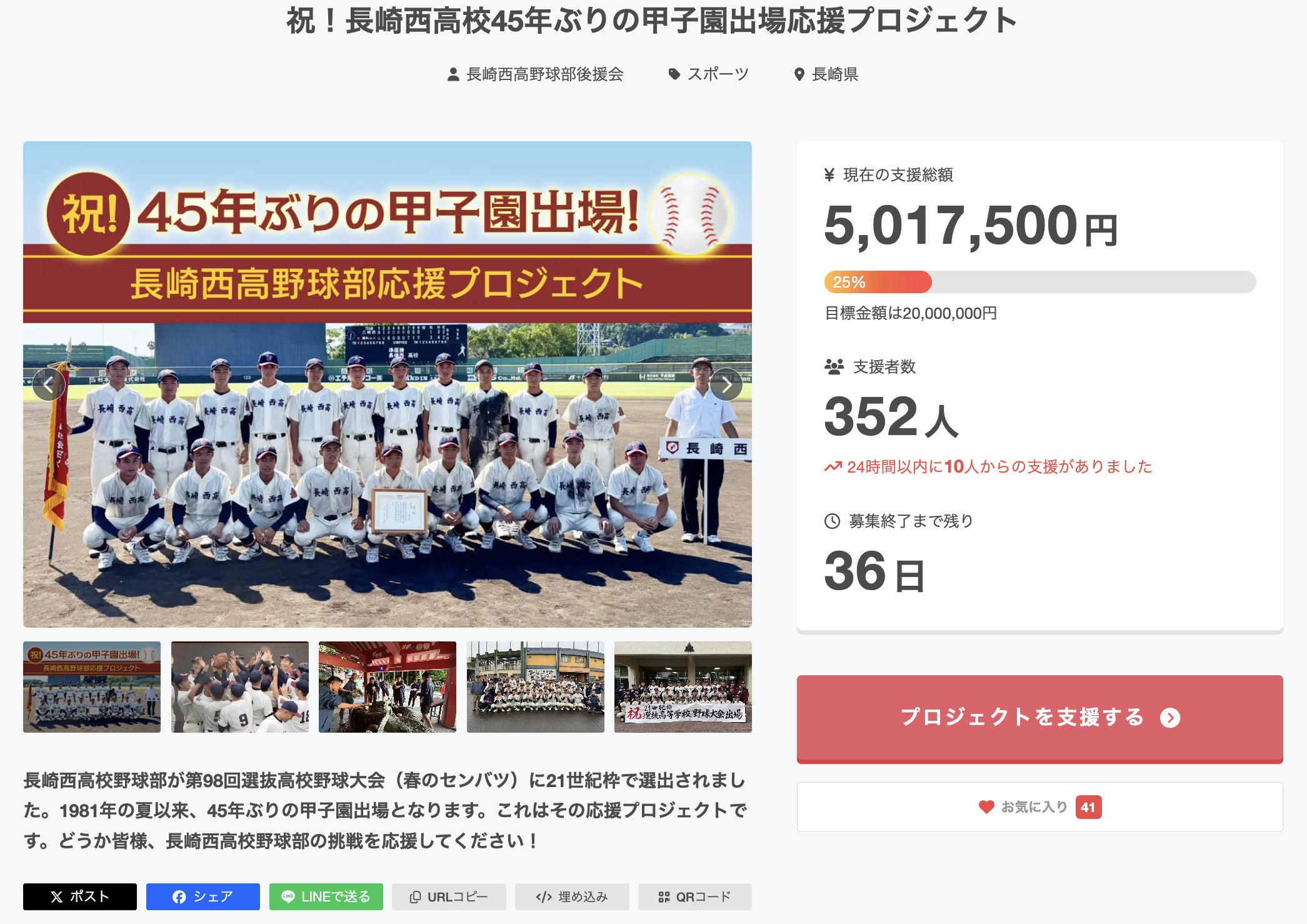 リターン(返礼品)で大人気の【選抜出場記念エコボールペン】のデザインが決まりました。ボディの色はネイビーで、本体部分に白く「長崎西高 第98回 センバツ出場記念」の文字が入ります。このボールペンはバンブーファイバー(竹繊維)を素材に使用したエコボールペンです。長崎西高校という高校名やセンバツの回数などが入るので、今回の甲子園出場記念にピッタリですね。これまで、5,000円のリターンを選んで複数個を希望される方もいらっしゃいますし(その場合、個数に応じて10,000円、15,000円、20,000円の支援になります)、他の10,000円以上のリターンにも付いているので、そちらを選んでキャップやTシャツなどと共に手に入れることもできます。ぜひぜひご検討ください!※このプロジェクトをご自身のSNSで発信したり、お知り合いの方へシェアするなどして、拡散していただけると嬉しいです!ページ内にあるX、Facebook、LINEのボタンやURLコピーのボタンなどをご利用ください※URLを直接送る際には下記にてお願いしますhttps://camp-fire.jp/projects/921492/view※QRコードはこちらです