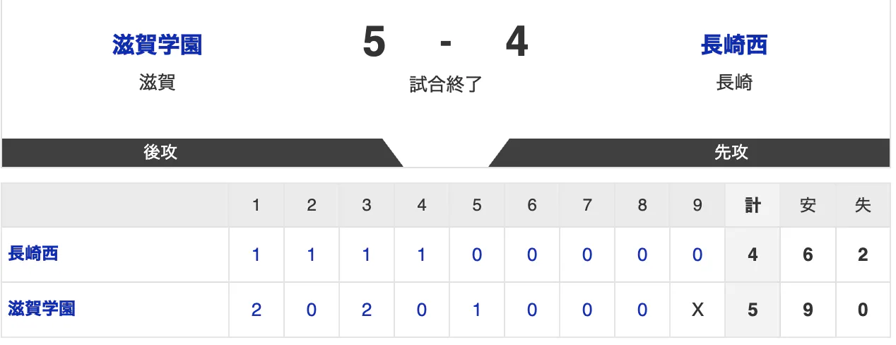 本日の第一試合、長崎西と滋賀学園の対戦は5−4で滋賀学園が勝利。長崎西は大健闘も及ばず残念ながら1回戦敗退となりました。