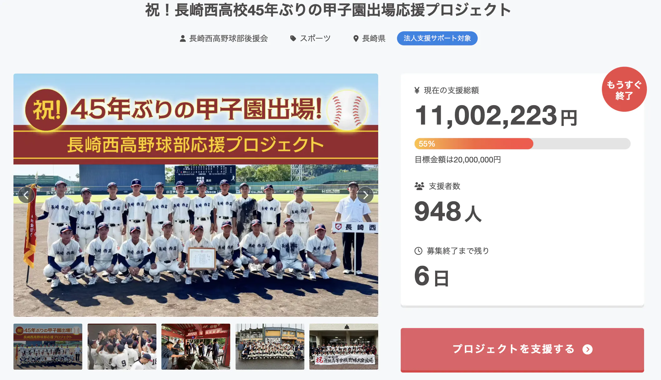2026/03/25 10:48このクラウドファンディングも残すところあと6日となりました。これまで948人の皆様にご支援をいただき大変ありがとうございます。長崎西高野球部の甲子園での戦いは、応援してくださる皆様にとってとても希望の持てるものだったのではないでしょうか。選手たちは本当によく頑張ったと思います。また夏に向けてさらに頑張ってほしいという願いもこちらにたくさん寄せられています。4月には鹿児島県で行われる九州大会への出場が決まっています。甲子園という大舞台での得難い経験が、今後のさらなるチーム力向上に結びつけば良いと思います。引き続き皆様からの応援やご支援を最後までどうぞよろしくお願い致します。 もっと見るクラウドファンディングは3月31日まで継続しています!