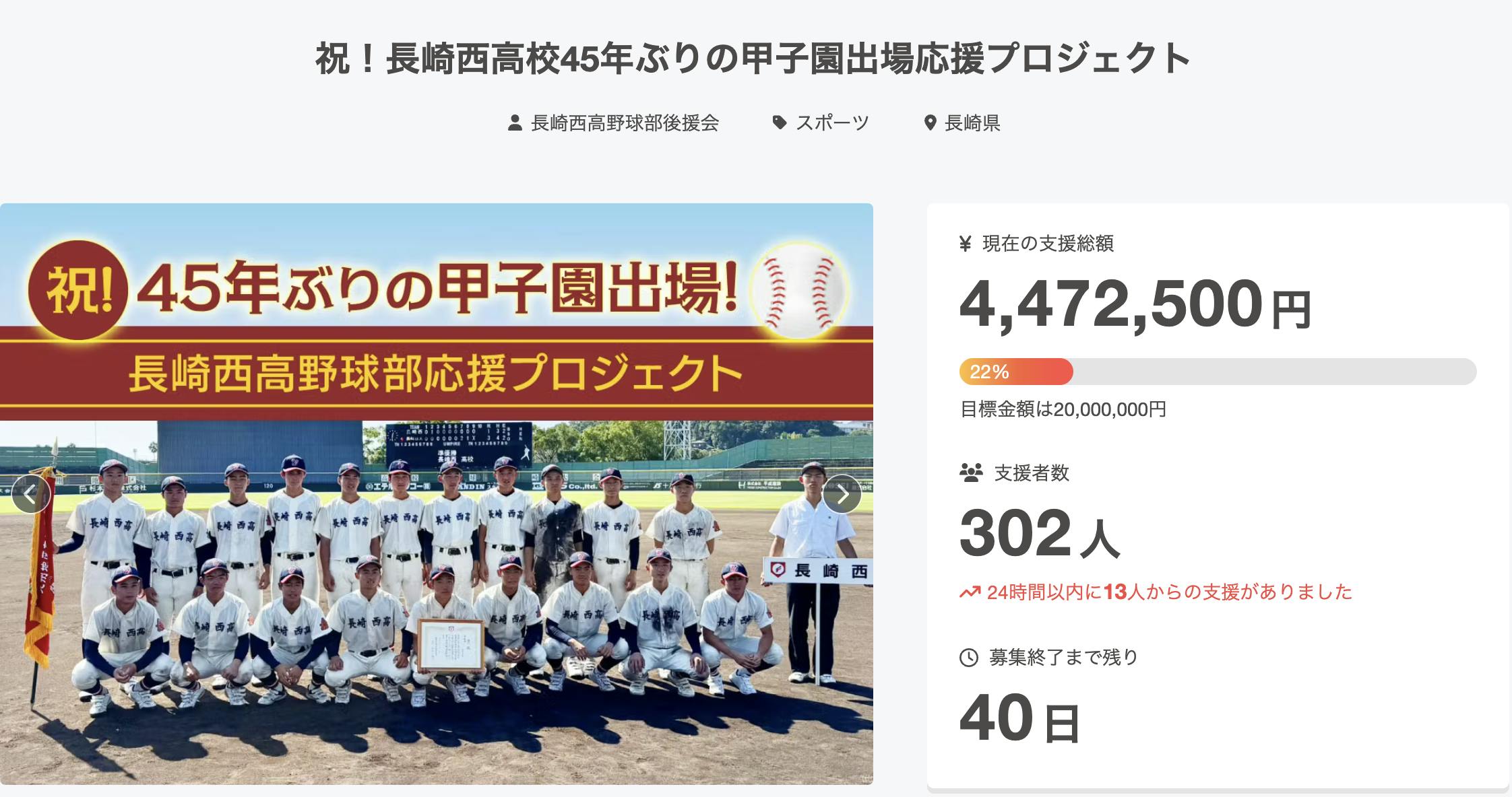 • ご覧いただきありがとうございます。昨日、支援総額が400万円を突破しました!200万円から400万円まで、わずか5日。日々、全国各地からご支援が増えているのを肌で感じます。とうとう目標金額の20%を超えました。長崎西高野球部が甲子園の土を踏むまであと約1か月と少し。組み合わせ抽選は3月6日です。目標達成まで、応援のほどよろしくお願い致します。※このプロジェクトをご自身のSNSで発信したり、お知り合いの方へシェアするなどして、拡散していただけると嬉しいです!ページ内にあるX、Facebook、LINEのボタンやURLコピーのボタンなどをご利用ください※URLを直接送る際には下記にてお願いしますhttps://camp-fire.jp/projects/921492/view※QRコードはこちらです もっと見る
