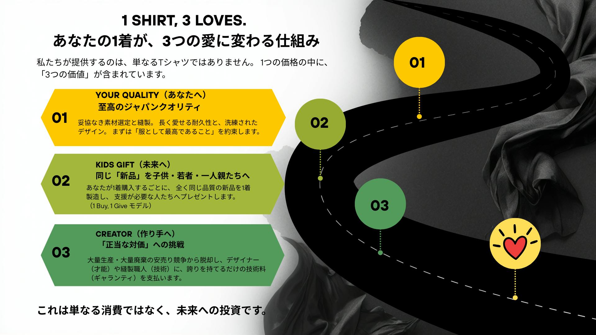 1 love(共犯)自分のために買った服が、誰かのプライドになる。「自分を愛すること(Self)」と「誰かを愛すること(Give)」は、実は同じことなんだ。言葉はいりません。同じ服を着ていること、それが僕ら**「共犯者」の絆**です。