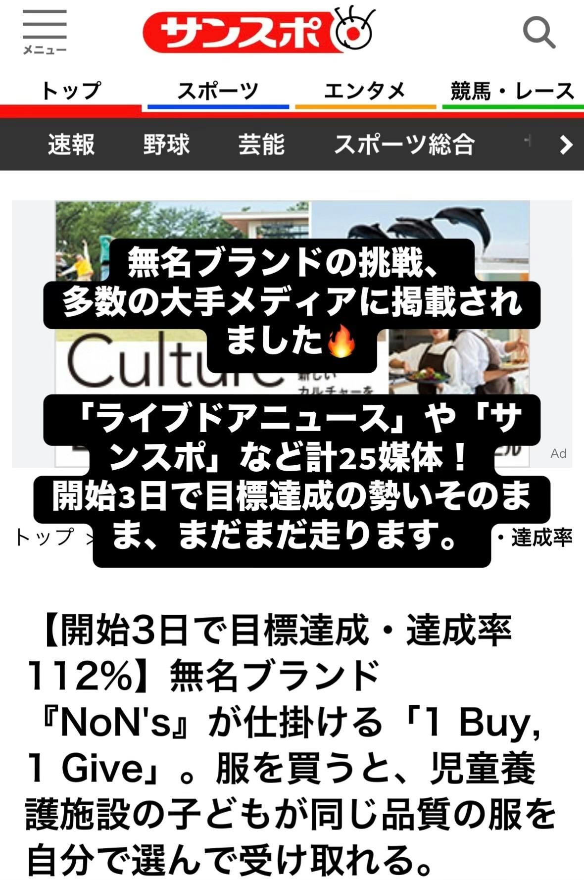 2026/03/01 08:15【メディア掲載25社突破!】ご支援いただいた皆様、そして今ページを見て迷っている方へ皆様、こんにちは。NoN's代表です。本日は、皆様に最高のご報告がございます!私たちの「1 Buy 1 Give(服を1着買うと、児童養護施設の子どもにも新品が1着届く)」という挑戦についてのプレスリリースが、「ライブドアニュース」や「サンスポ」をはじめとする、計25の大手メディアに掲載されました。開始わずか3日で目標を達成し、こうして世の中のメディアからも評価をいただけたのは、立ち上げたばかりの無名ブランドの「想い」と「重い看板」を真っ先に信じ、安くないご支援を託してくださった最初の『共犯者』である皆様のおかげです。本当に、心から感謝申し上げます。そして、今この活動報告を読んで、「支援しようか迷っている」という方へ。私たちは、ただ服を売るためだけにこのブランドを立ち上げたわけではありません。児童養護施設の子どもたちに、誰かのお下がりや余り物ではなく、「自分で好きな服を選ぶ喜び」をどうしても届けたい。その泥臭い意地と覚悟だけで走っています。今回のメディア掲載は、その想いが世の中に確実に届き始めている証拠です。ブランドとしてはまだ始まったばかりの小さな船ですが、私たちは一切の退路を断ち、本気でトップを目指してこの戦場で暴れ回る覚悟です。もし、私たちの「生き様」や「1 Buy 1 Give」の理念に少しでも共感していただけたなら、ぜひあなたの力も貸してください。私たちと一緒に、最高の景色を見にいく『共犯者』になってくれませんか?クラウドファンディングの挑戦はまだまだ続きます。既存の共犯者の皆様も、これから出会う皆様も、引き続きNoN'sをよろしくお願いいたします!一緒にデカい夢を見ましょう! もっと見る【目標100%達成&112%突破!】最高の共犯者の皆様へ。次なる戦い(ネクストゴール50万)へ挑みます!