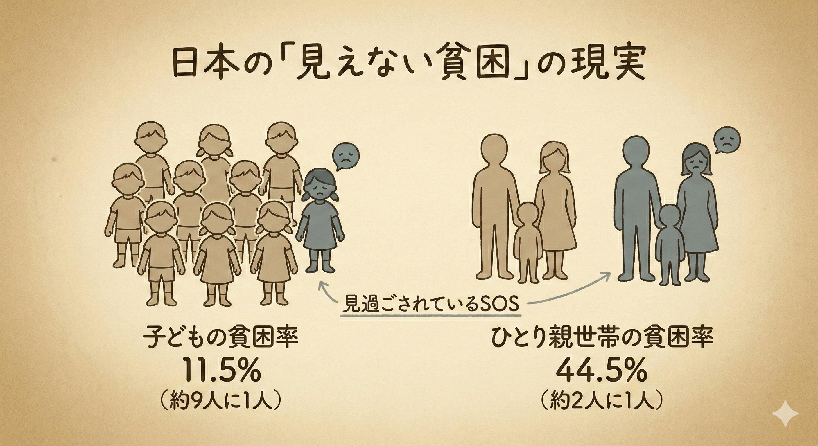子どもの約9人に1人。ひとり親世帯の2人に1人が、経済的に苦しい状況にあります。給食が唯一の栄養源だったり、サイズが合わない服を我慢して着ている子が、今の日本にこれほどいるのです。