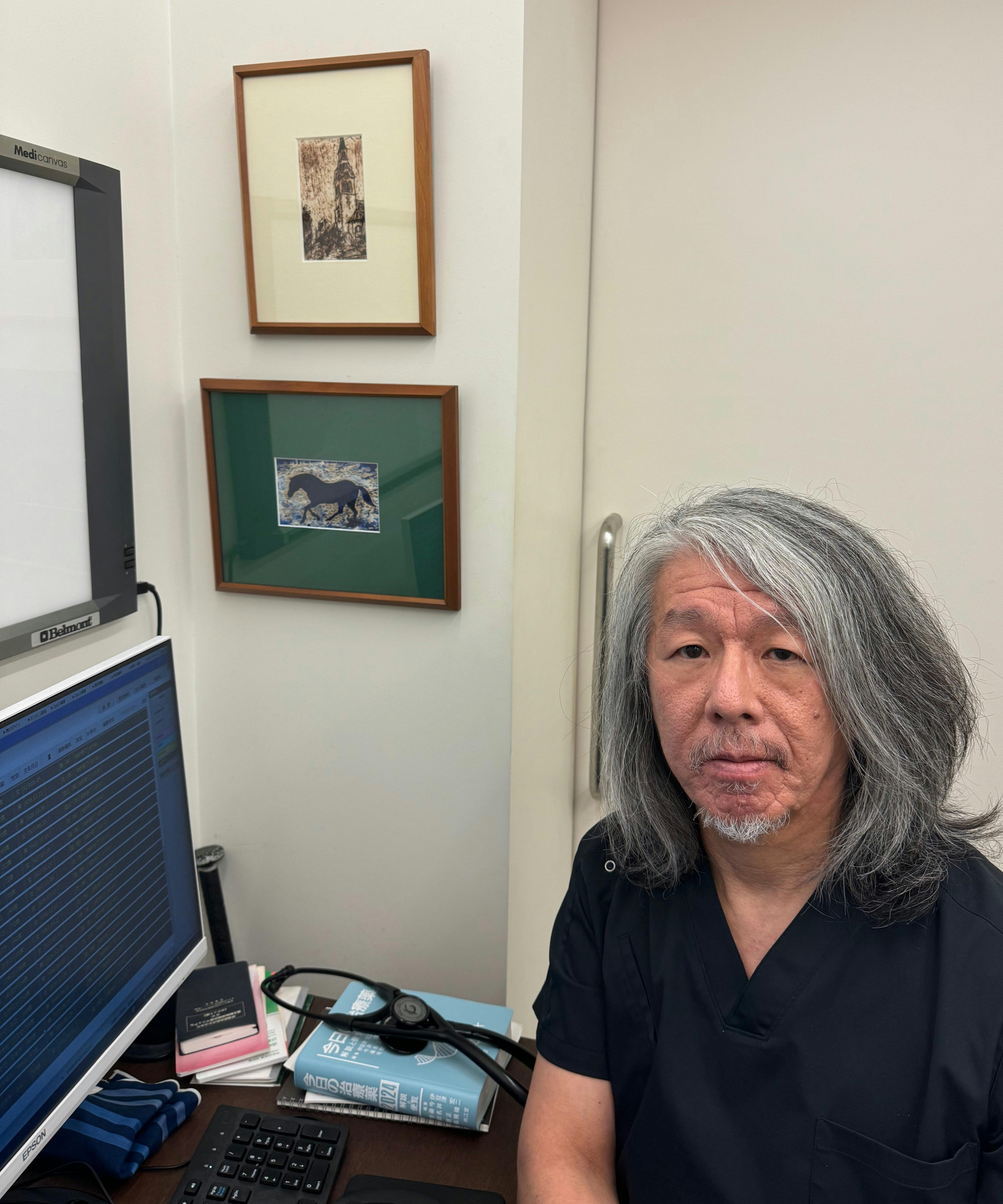 ある日の診察室の光景。恩師が描いた絵とともに。
