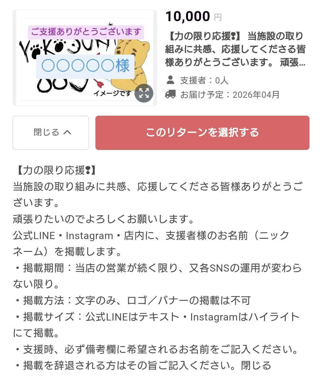 皆様のご負担を少しでも減らし支援いただく為に【力の限り応援❢】1万円リターンを新しく設定いたしました!