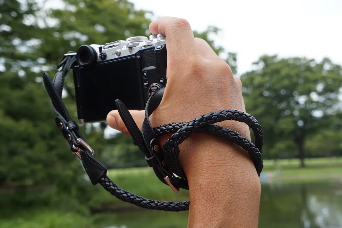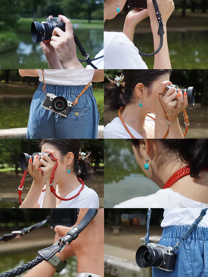 細くてしなやかな上に適度なテンションがあるので、カメラを支える手やシャッターを押す指を避けるように革ストラップがしなり、写真撮影に集中することができます。首に当たるネック部分には、手編みにした8本の革紐の上から背当てを施すことにより、長時間使っても首への負担を軽減します。