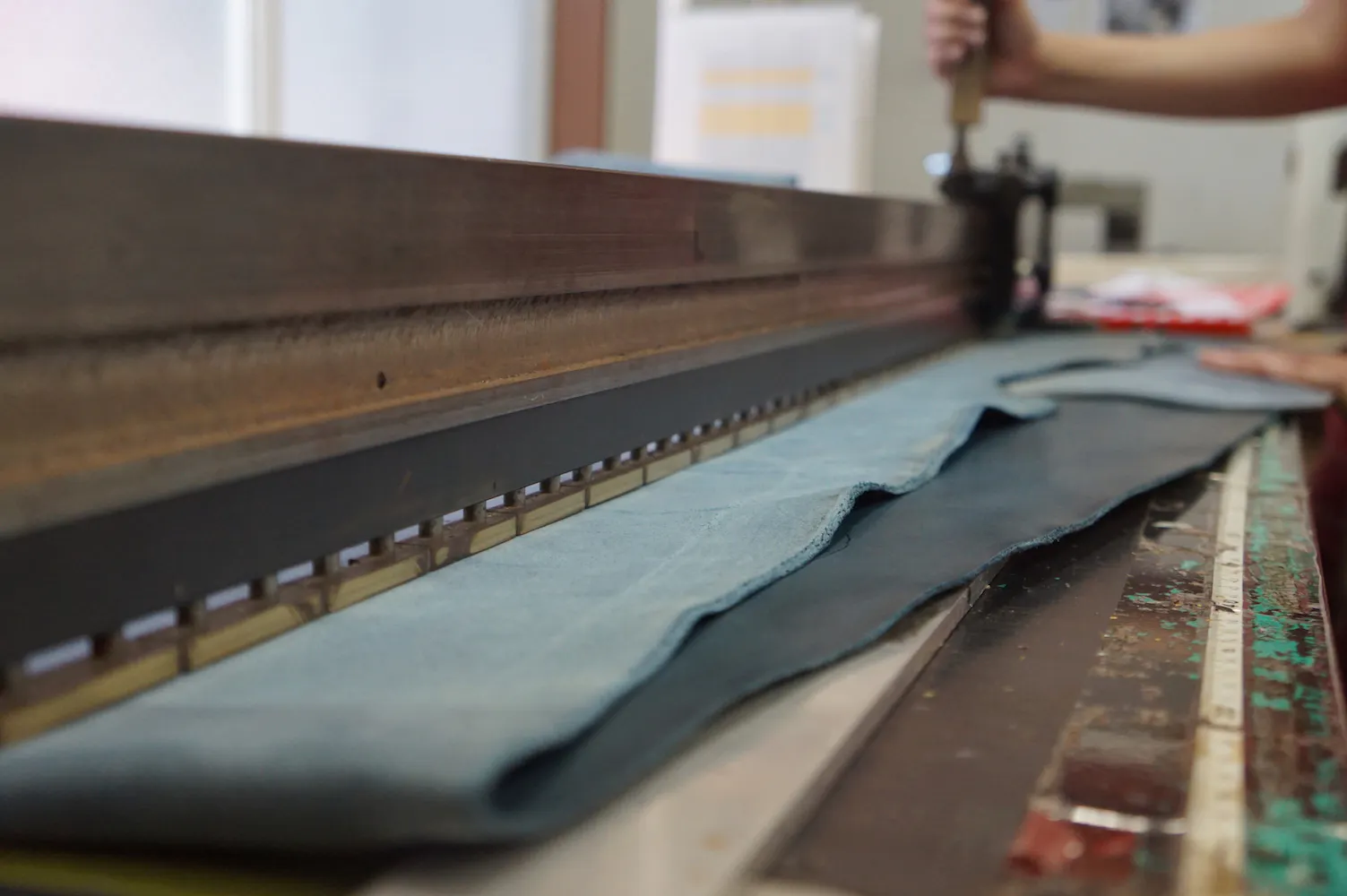 栃木レザーの一枚革を裁断機で裁断。製造するアイテムに応じて幅を決定。