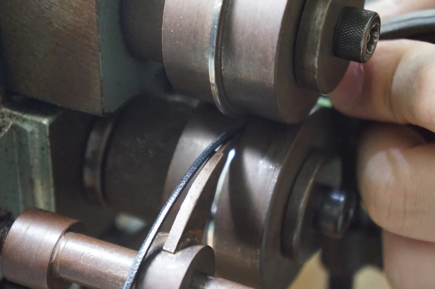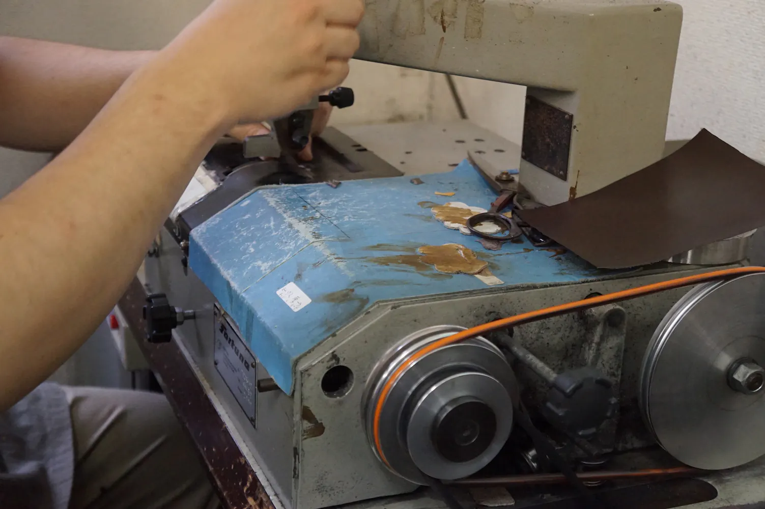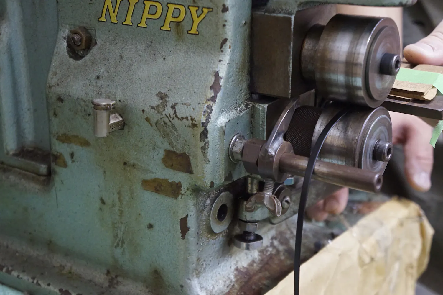 一枚一枚の革を繋ぐ際、繋ぎに段差が出来ないよう斜面に薄くする機械です。