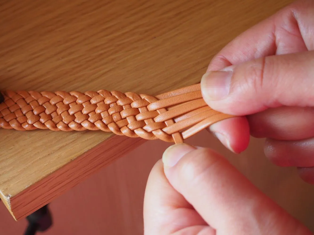 8本の革紐を使用し、一本一本、一目一目丁寧に時間をかけて編み込んでいきます。