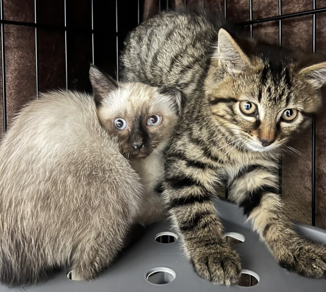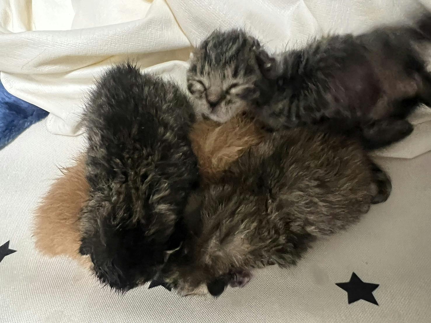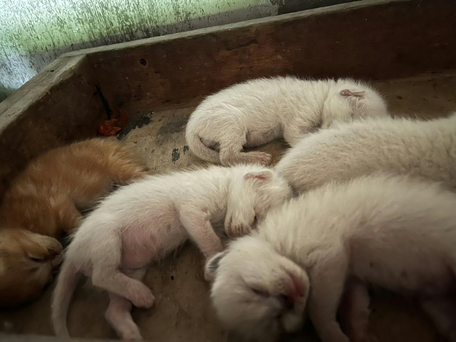 (人間の手により母猫と引き離された子猫たちを保護した写真)