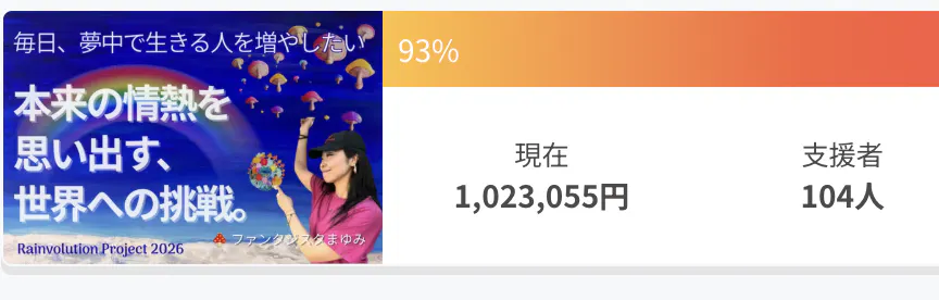 2026/03/27 11:30ファンタジスタまゆみです!!速報ーー!本日!0:01 110万!110名目!一気にこの三日間で、目標達成しましたぁー!!!!!!この三日間、奇跡みたいな勢いで、わたしの仲間が一丸となって応援してくれたおかげです!ありがとうございます!まさか、こんなカタチで第一目標を越えられると思っていませんでした!!ありがとうございます!!!本当にチームで盛り上げてくれたおかげでしかないです!!伝える機会をたくさん与えてくださりありがとうございました!そしてみなさんの言葉でわたしを伝えてくれた!!これが大きな力だったと思ってます!!ありがとうございます!!!みたことのない世界を、みにいこうといったその言葉は、すでにこのプロセスの最中に、味わったこともない感情を味合わせていただいてます!ともにそれを味わってくださった共有したエナジーが宝物です!ありがとうございます!!次のゴールにすでに向かっています!\世界中の色を集めるプロジェクト!/Rainvolution Project 2026!!毎日、夢中で生きる人を増やしたい!本来の情熱を思い出すあなたへの招待状https://camp-fire.jp/projects/921731/ideaネクストステージいきましゅ!185!!みなさま!!!ありがとうございます!!!!!今日から三日!東銀座のお祭りで、商売繁盛のエナジーを振り撒いていきたいと思います!ファンタジスタまゆみ もっと見る