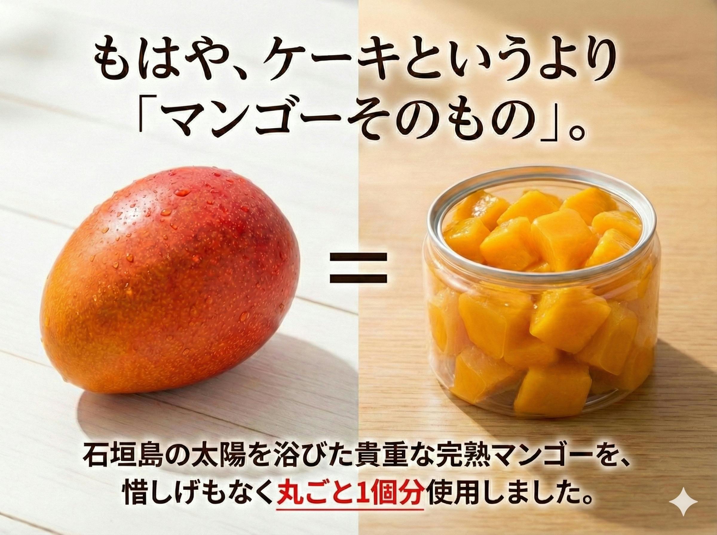 石垣島の太陽をいっぱいに浴びた「完熟アップルマンゴー」を丸ごと1個分、贅沢に閉じ込めました。自分へのご褒美や、大切な方への特別なギフトにいかがでしょうか。