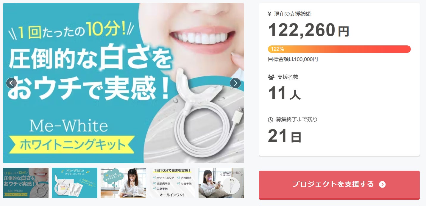 目標を達成した今、All-in方式ですのでリターンの発送は確約されています。 「気になっていたけれど、目標に届くかな?」と迷われていた方も、ぜひこの機会に「Me White」の革新的なホワイトニング体験を予約していただければ幸いです。