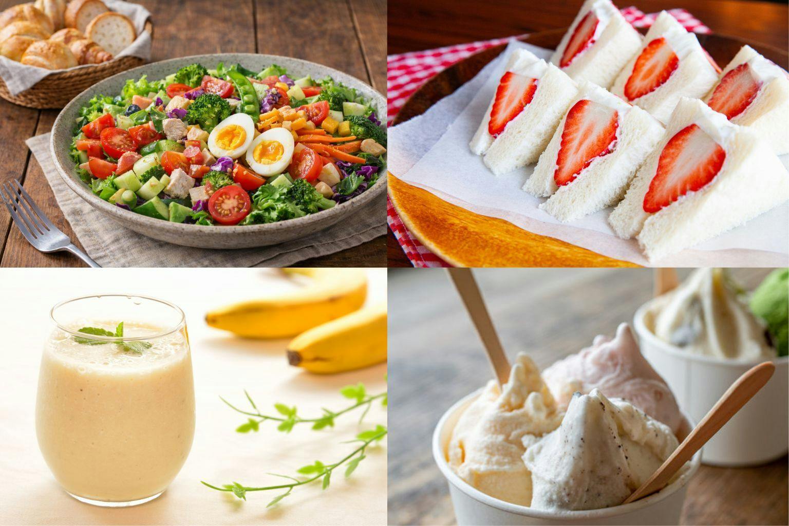 ドリンクは、バナナスムージーやいちごスムージー。旬の時期にはフレッシュな果実を添え、果物本来のやさしい甘さをそのまま感じられる一杯にします。