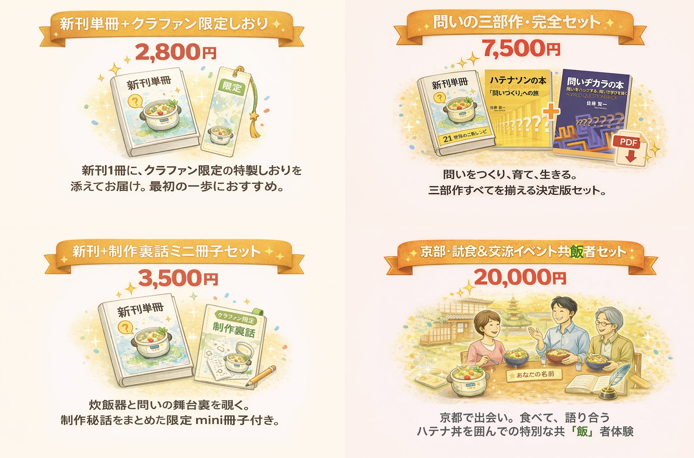 この本は、私にとって「料理本」でもあり、ハテナソンの実験の延長線でもあります。問いは、教室だけでなく、会議室だけでなく、台所にも、食卓にも、世界にもある。そう信じて、これまでの活動のすべてを、この一冊に炊き込みました。