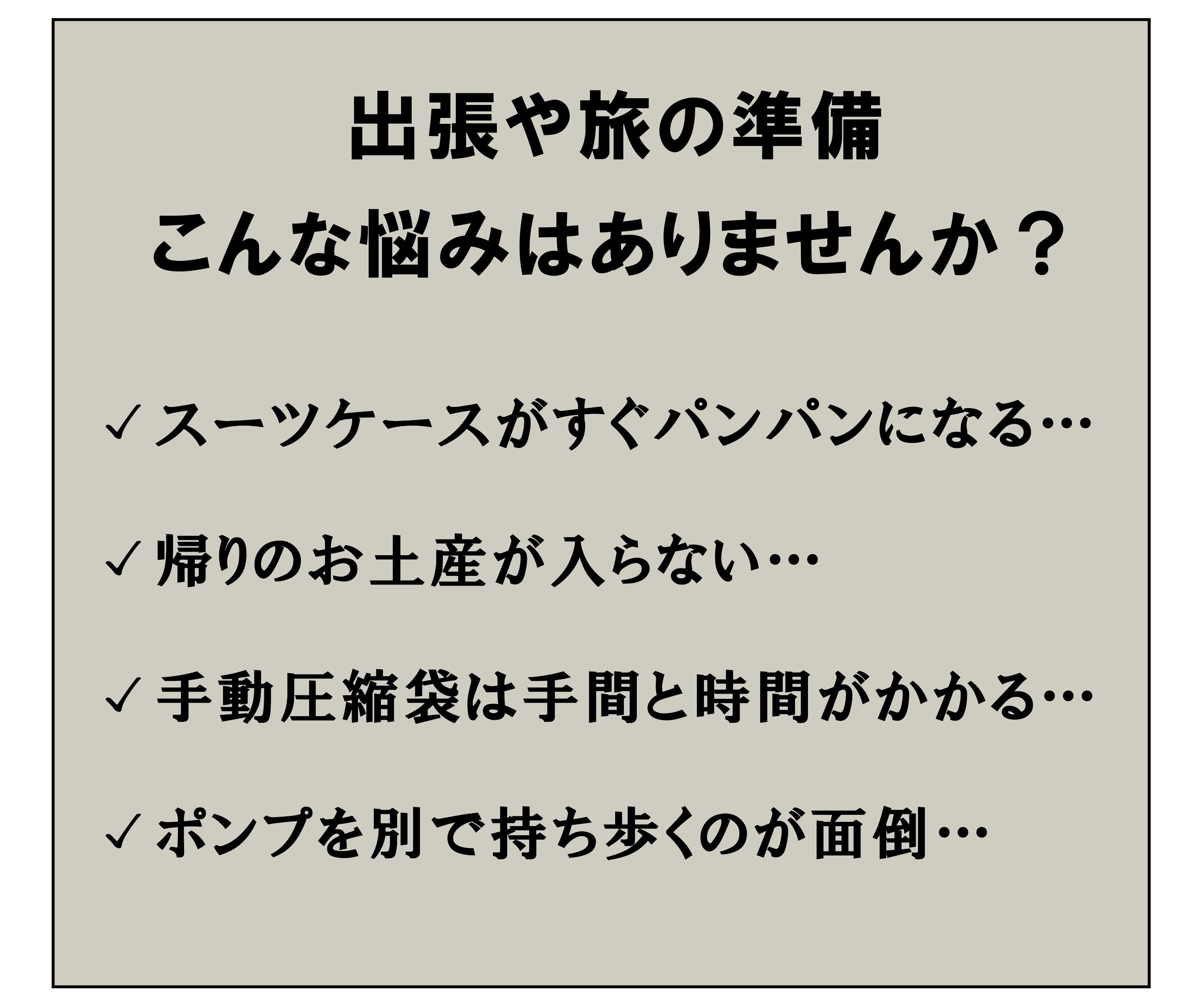 はい、不要です。GEARPACKはポンプを本体に内蔵しているため、掃除機や専用ポンプなどの付属品を用意する必要はありません。バッグひとつで圧縮まで完結します。