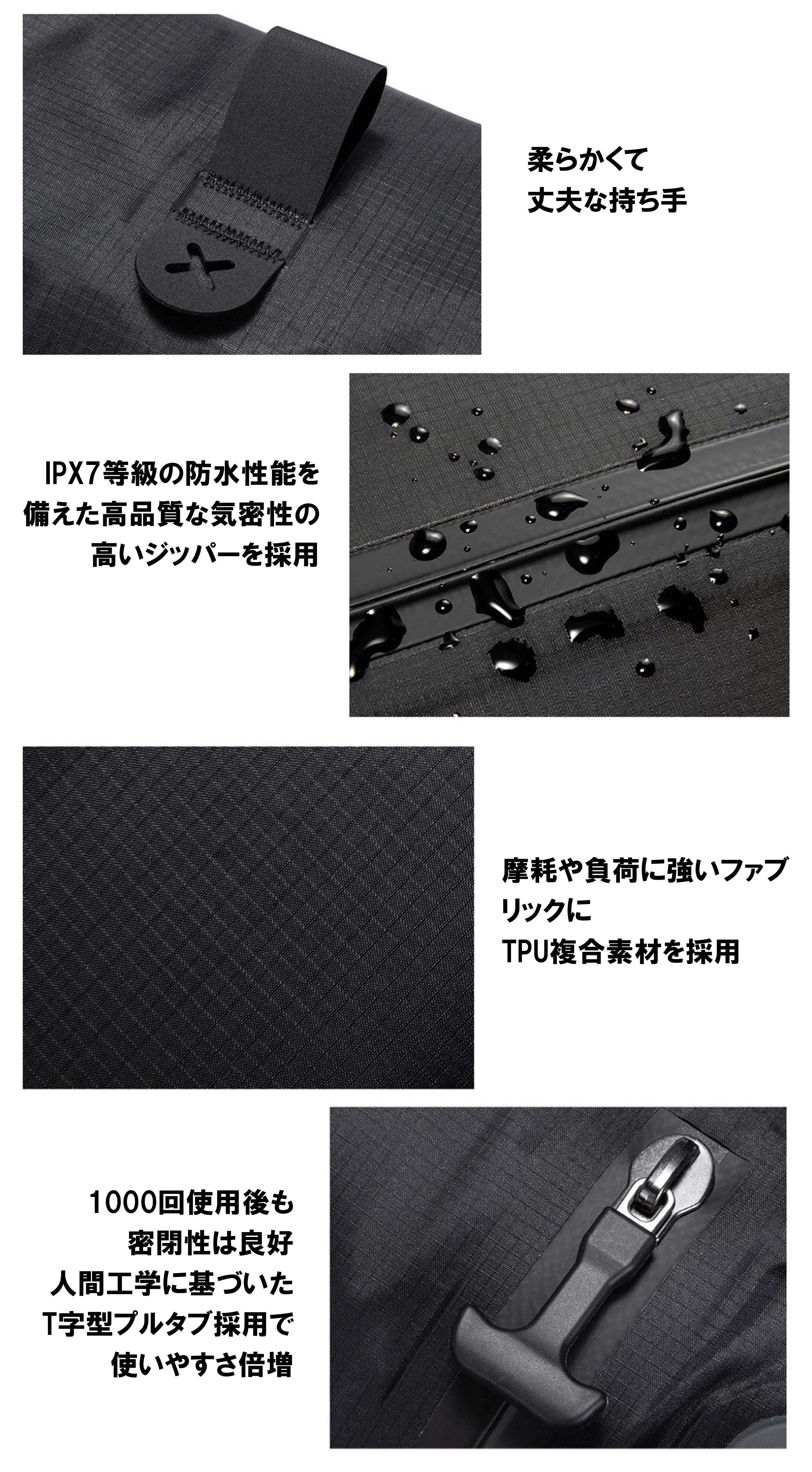 登山用レインウェアと同等クラスの防水性能により、小雨や濡れた床に置いた場合でも、バッグ内部の衣類や荷物をしっかりと保護。移動の多いシーンでも、気兼ねなく使えます。