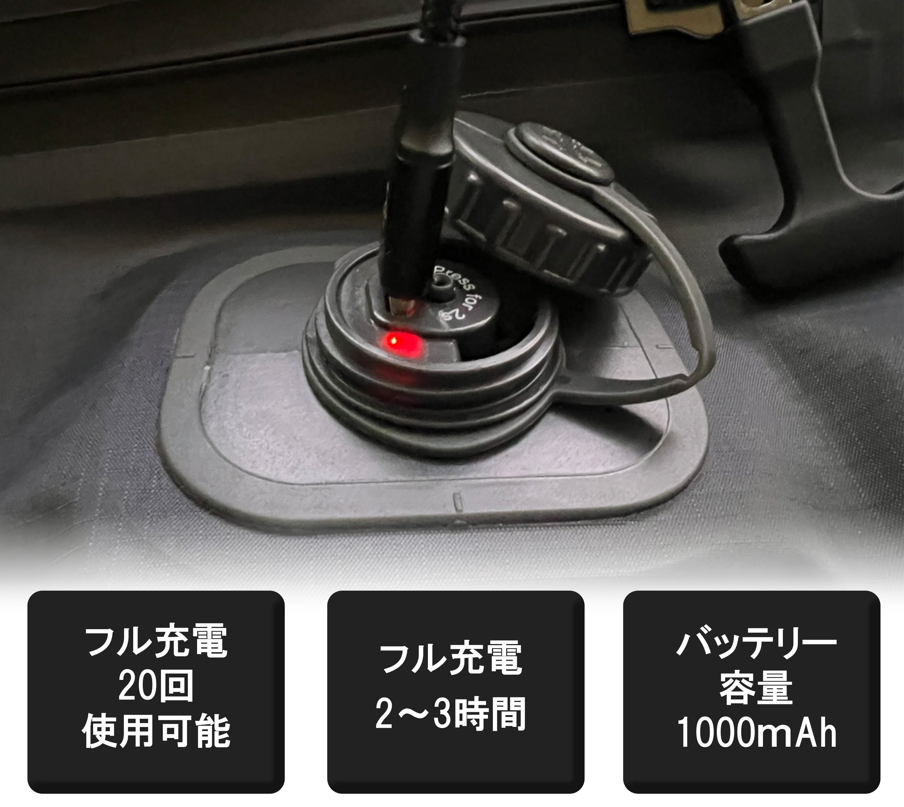 1000mAhのバッテリーを搭載しており、約2~3時間のフル充電で、1回あたり数十秒の吸引を約20回程度行うことが可能です。