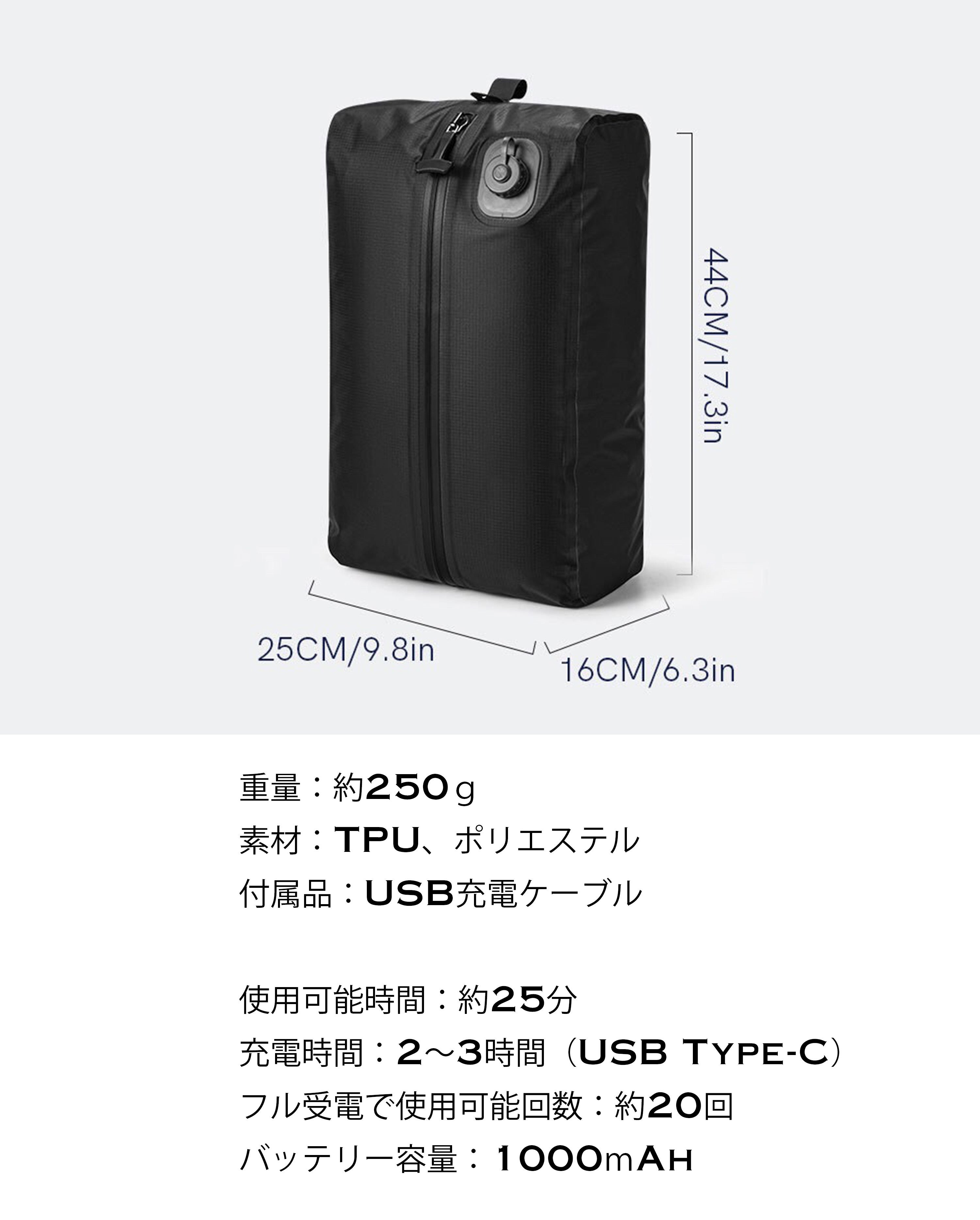 ボタン操作ひとつで内蔵ポンプが起動し、バッグ内部の空気を自動で吸引。