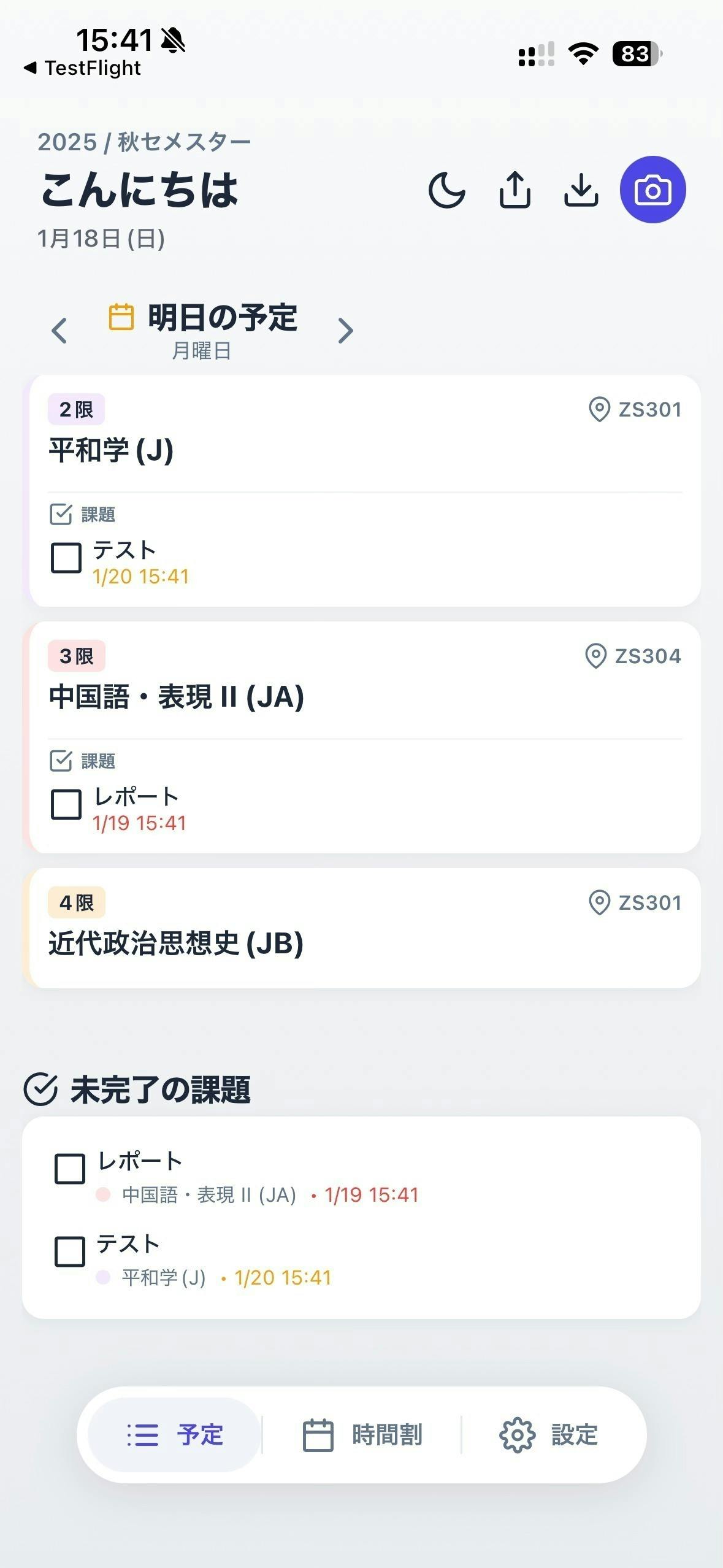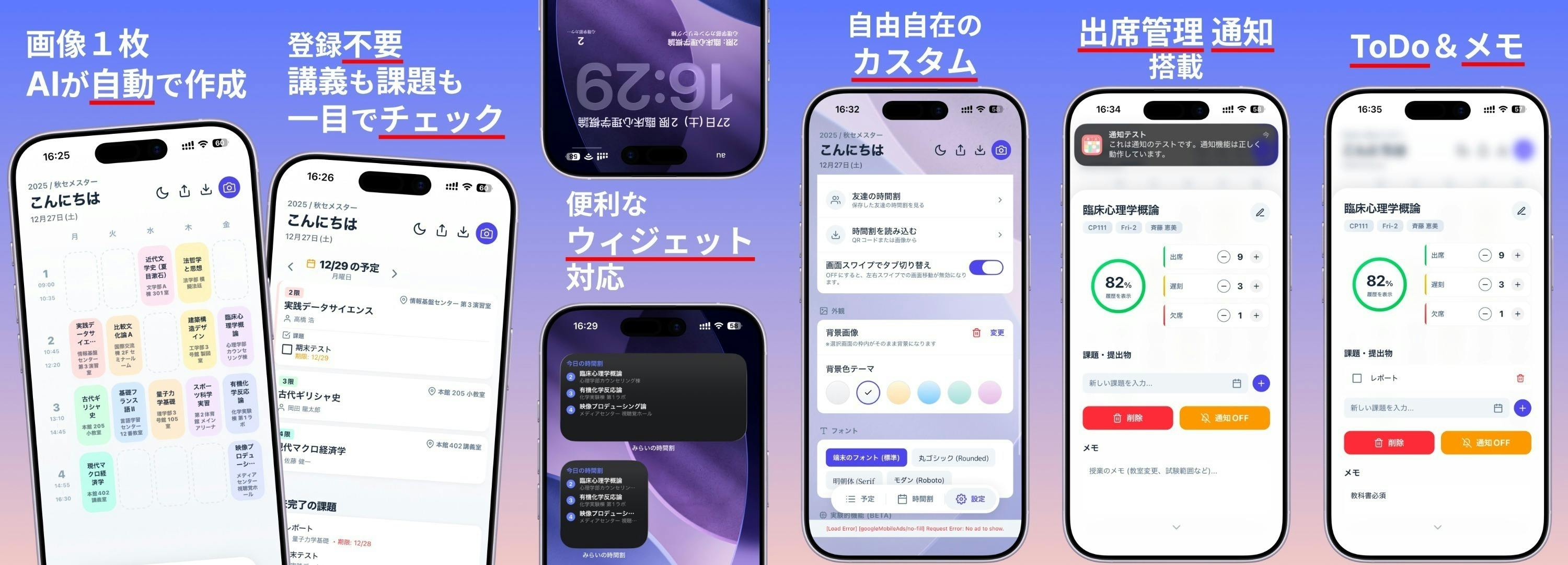 ・時間割のスクリーンショット(manabaなどの履修一覧画面)を読み込むだけで自動でAIがコマに授業を振り分けてくれます。授業前通知、メモ、画像添付、フォント&背景変更機能も搭載。課題一覧・授業一覧ウィジェットはios、android双方で対応。iosはロック画面にも配置可能です。