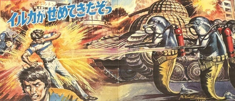 酸素ボンベを背負い光線銃で人間を襲うイルカの姿はトラウマ必至。