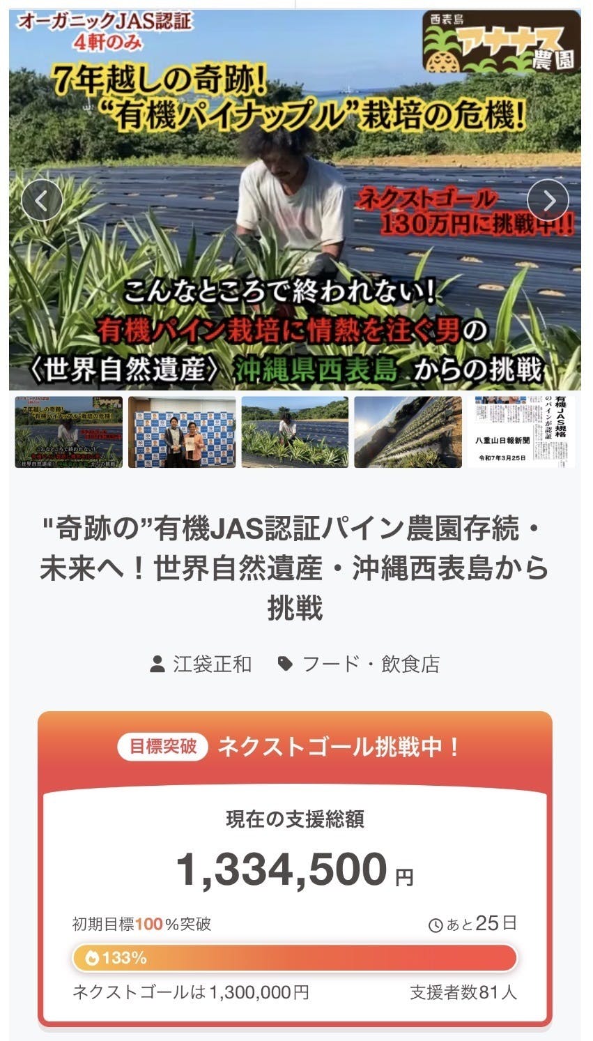 【ネクストゴール130万円達成しました!】皆さまの温かいご支援のおかげで、ネクストゴールとして掲げていた130万円を達成することができました。本当にありがとうございます。心より感謝申し上げます。最初の目標である100万円を達成することができ、さらにこうしてネクストゴールまで到達できたことに、正直とても驚いています。このプロジェクトを通して、西表島のパイナップルや有機栽培のことに関心を持ってくださる方がこんなにもいるのだと感じ、とても大きな励みになっています。皆さまからいただく応援やメッセージ一つひとつが、これからも前に進んでいく力になっています。クラウドファンディングはまだ続いています。最後まで見守っていただけたらとても嬉しいです。そしてこの挑戦を通して、西表島のパイナップルの魅力や、有機栽培の価値をこれからも多くの方に伝えていきたいと思っています。もしよろしければ、SNSでのシェアなどでこのプロジェクトを広めるお手伝いをしていただけたら嬉しいです。引き続き、どうぞよろしくお願いいたします。 西表島アナナス農園江袋正和
