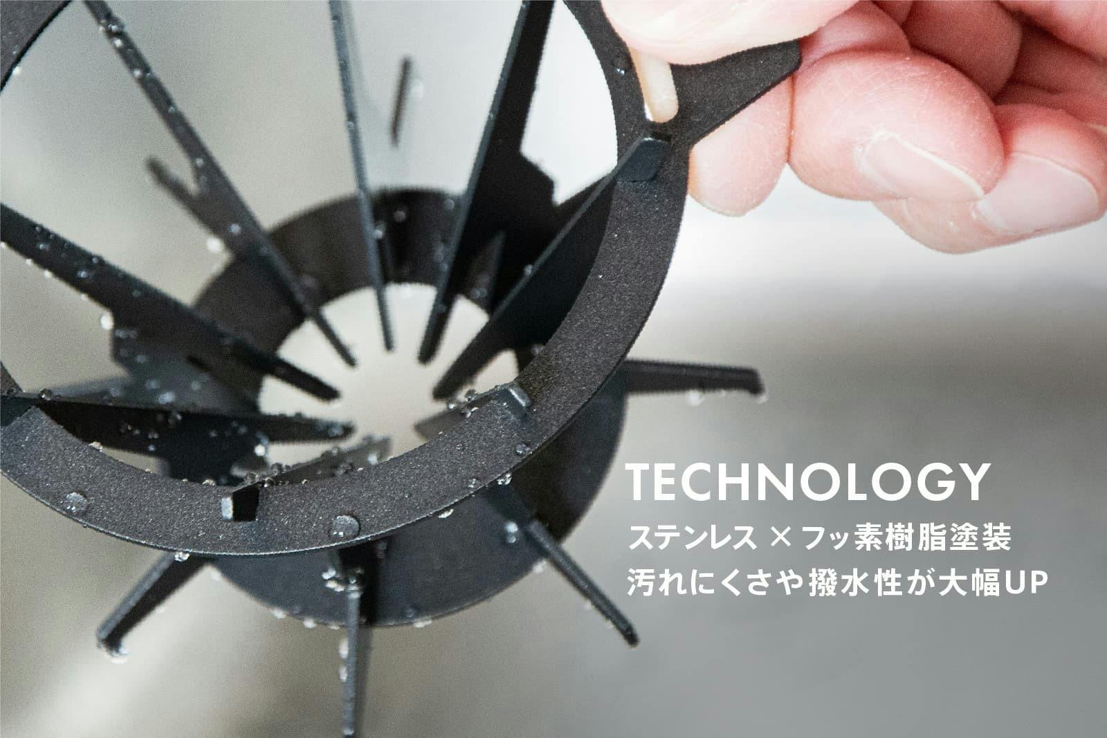 表面の仕上げはフライパンなどにも用いられる「フッ素樹脂塗装(黒)」。触り心地を良く、スタイリッシュな印象だけでなく、汚れが付きにくく水切れもよい機能面も兼ね備えています。