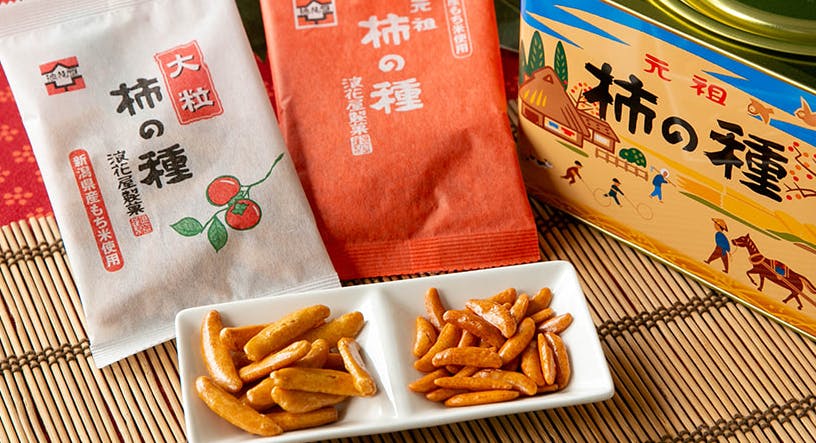長岡市の浪花屋製菓は、1923年(大正12年)に創業。「元祖浪花屋の柿の種」通常サイズの柿の種進物缶と、大粒サイズの柿の種進物缶のセット。それぞれに違った食感と味わいをお楽しみいただけます。日本人の心にまで染み渡るような、醤油味の素朴な美味しさが長く愛される理由。手土産や贈り物にも最適です。新潟では、言わずと知れたロングセラー商品「元祖浪花屋の柿の種」。素朴で懐かしい味わいがクセになる!手が止まらない美味しさです。