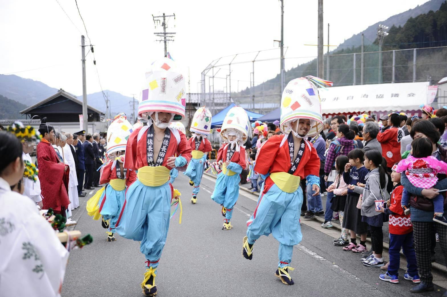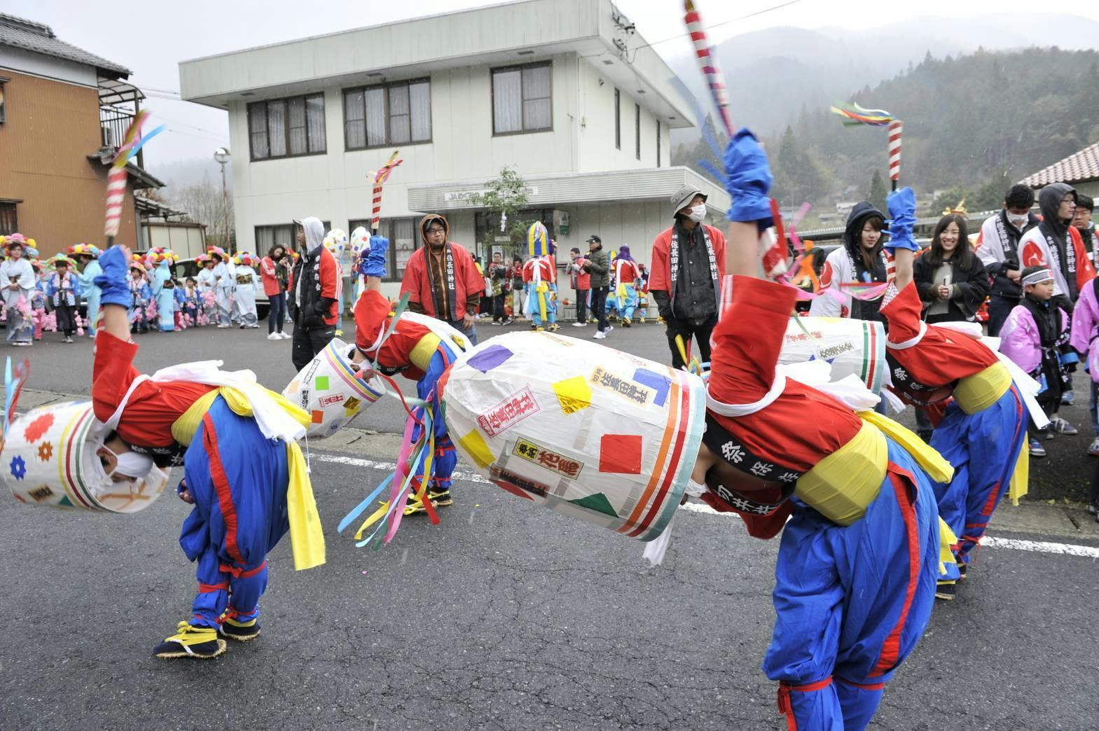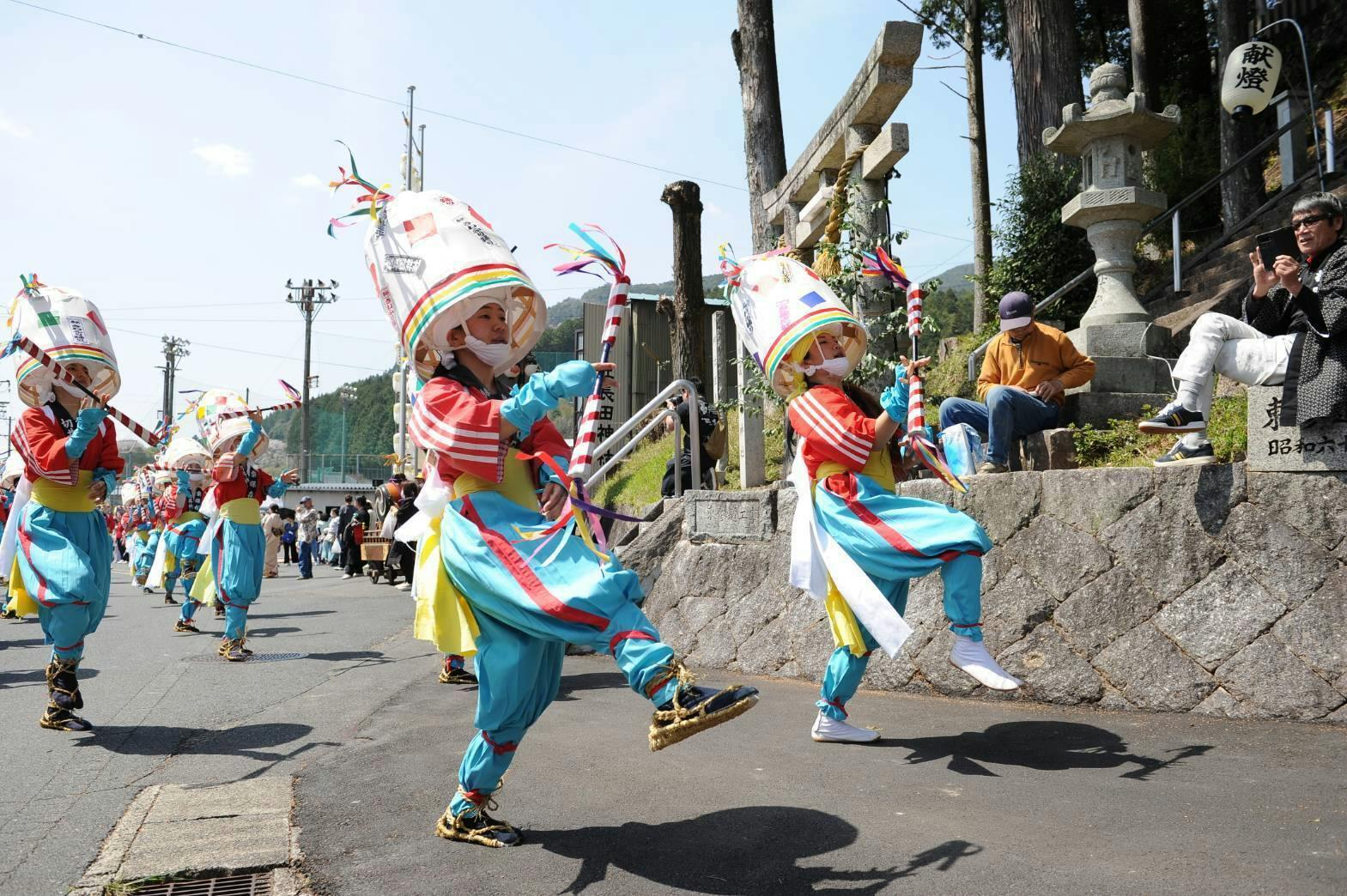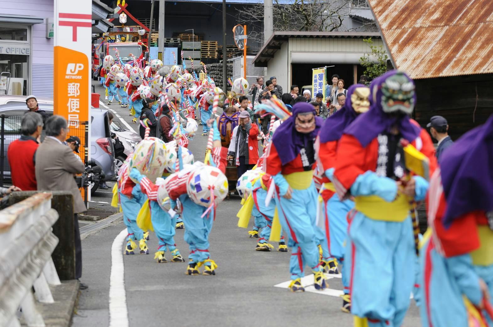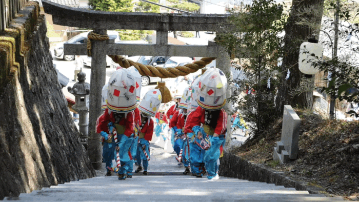 その後ろには、鬼やひょっとこのお面で軽快な踊りで春の訪れを賑わす。