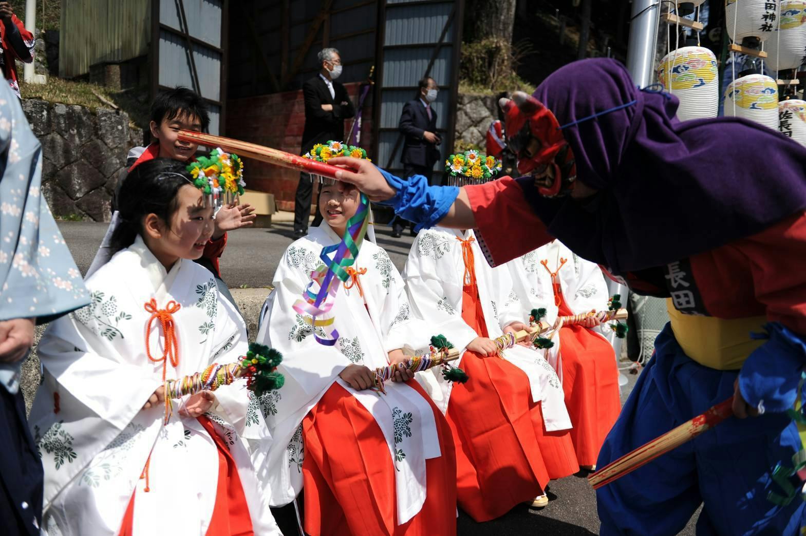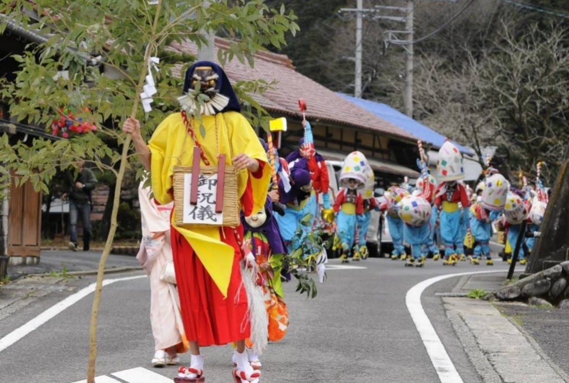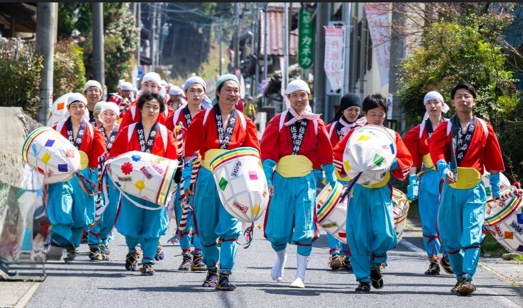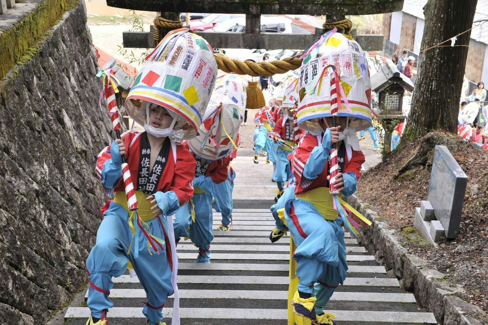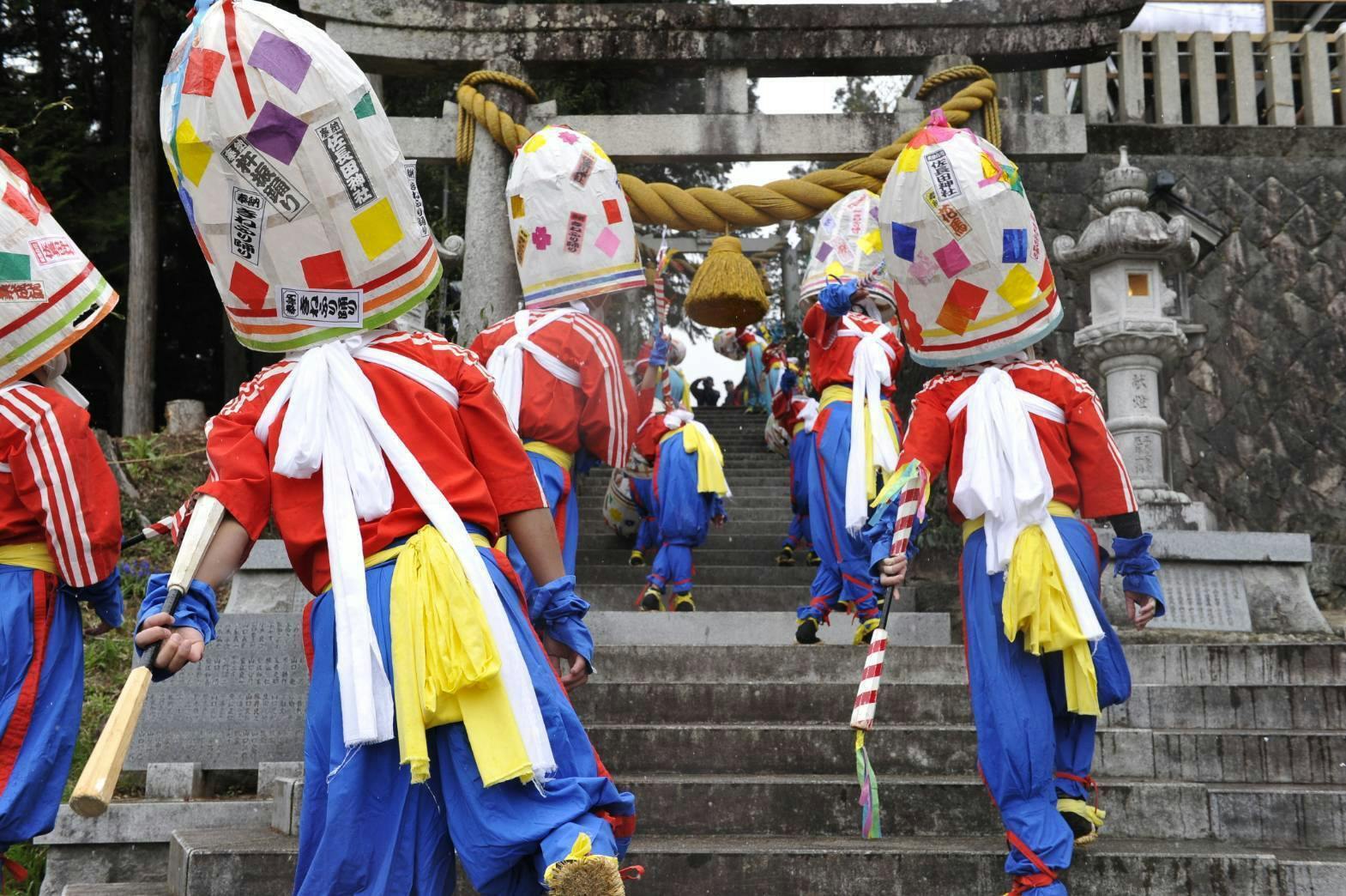 その後ろには、鬼やひょっとこのお面で軽快な踊りで春の訪れを賑わす。